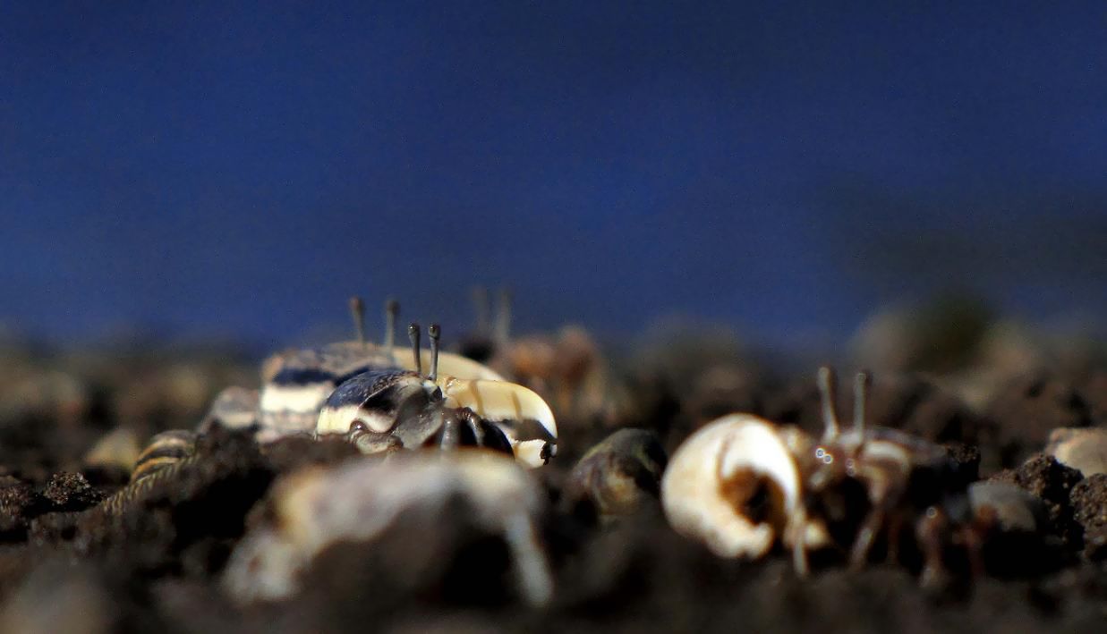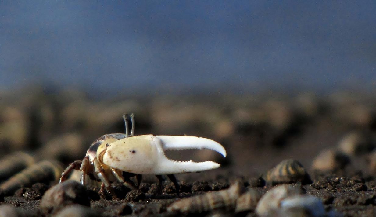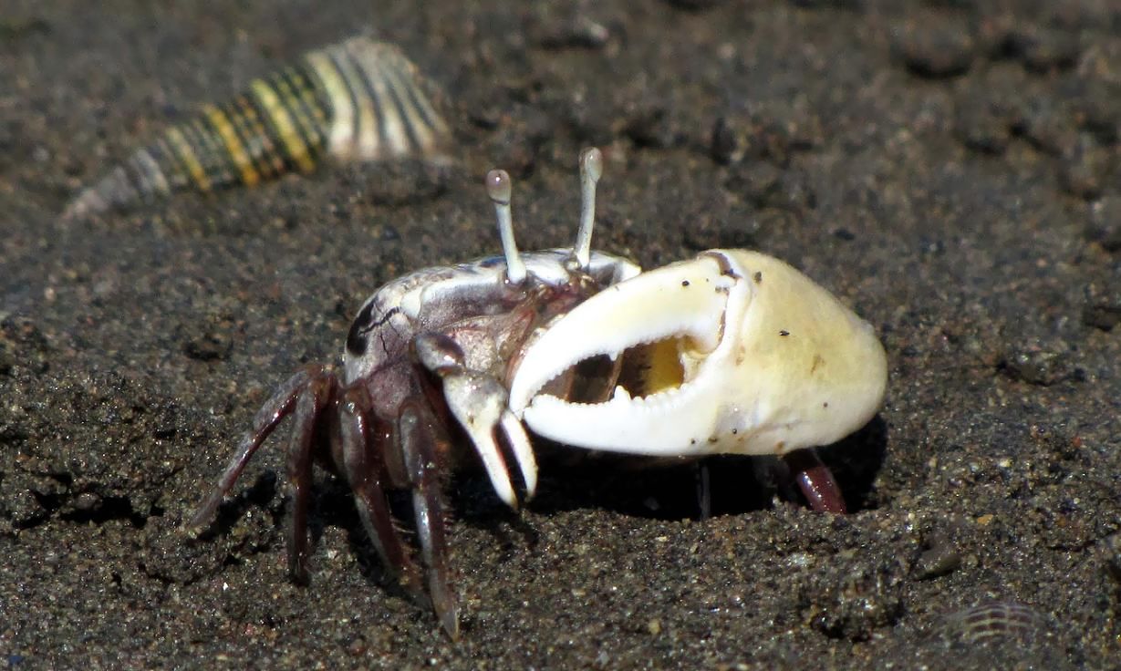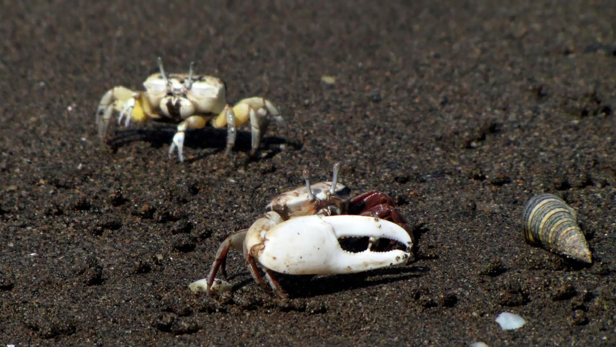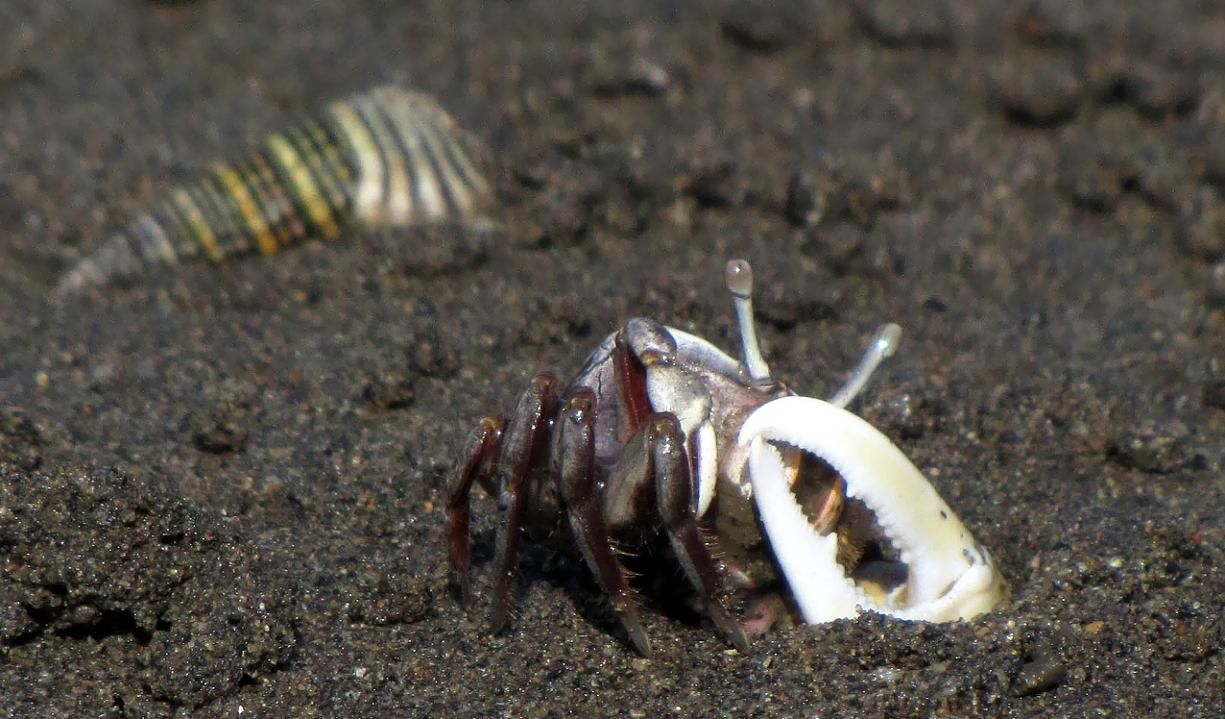オスは片方のハサミが大きくて、求愛する時には大きく振る仕草を見せます。エサやメスをめぐって喧嘩する時には、大きなハサミでつかみ合いをします。