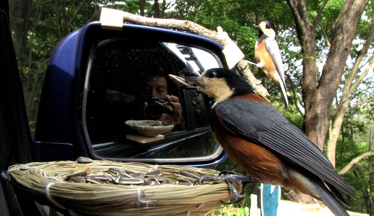 私が行かない時には、それぞれのヤマガラは散らばって行動していますが、車の音・色・形などを覚えていて、順次集まって来ているのです。・・・今は貯食の時期で、彼らは一生懸命に働き、あちらこちらにエサを蓄えています。