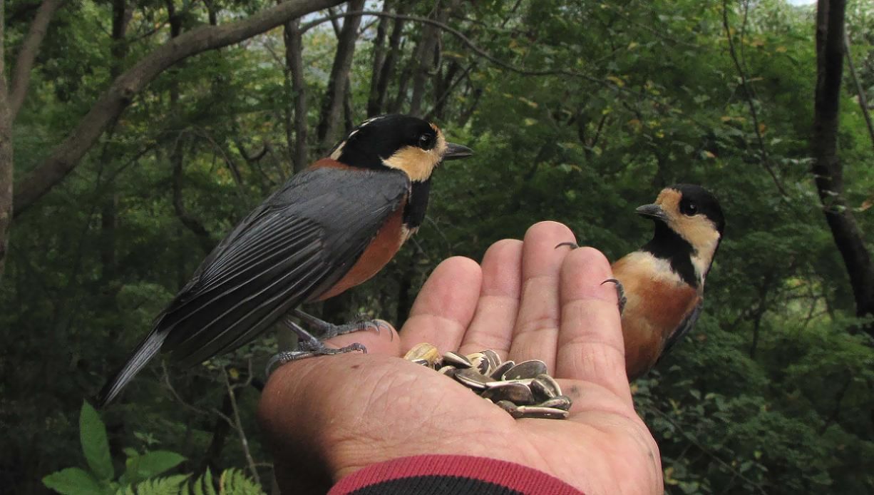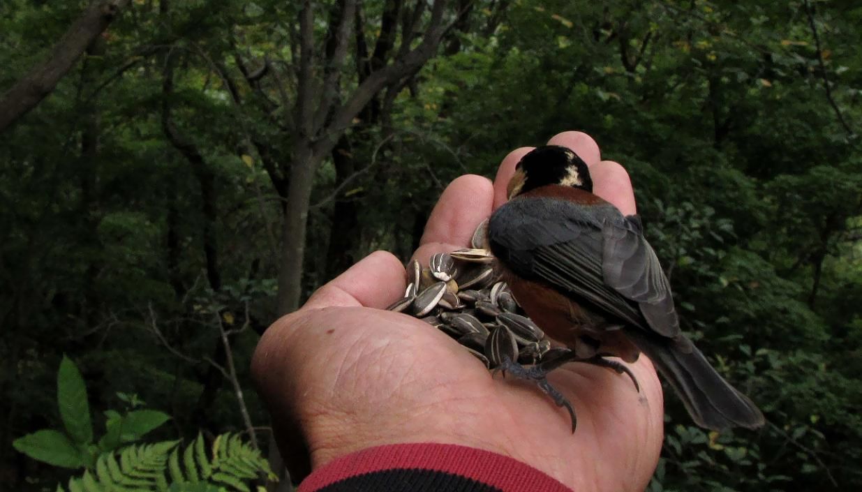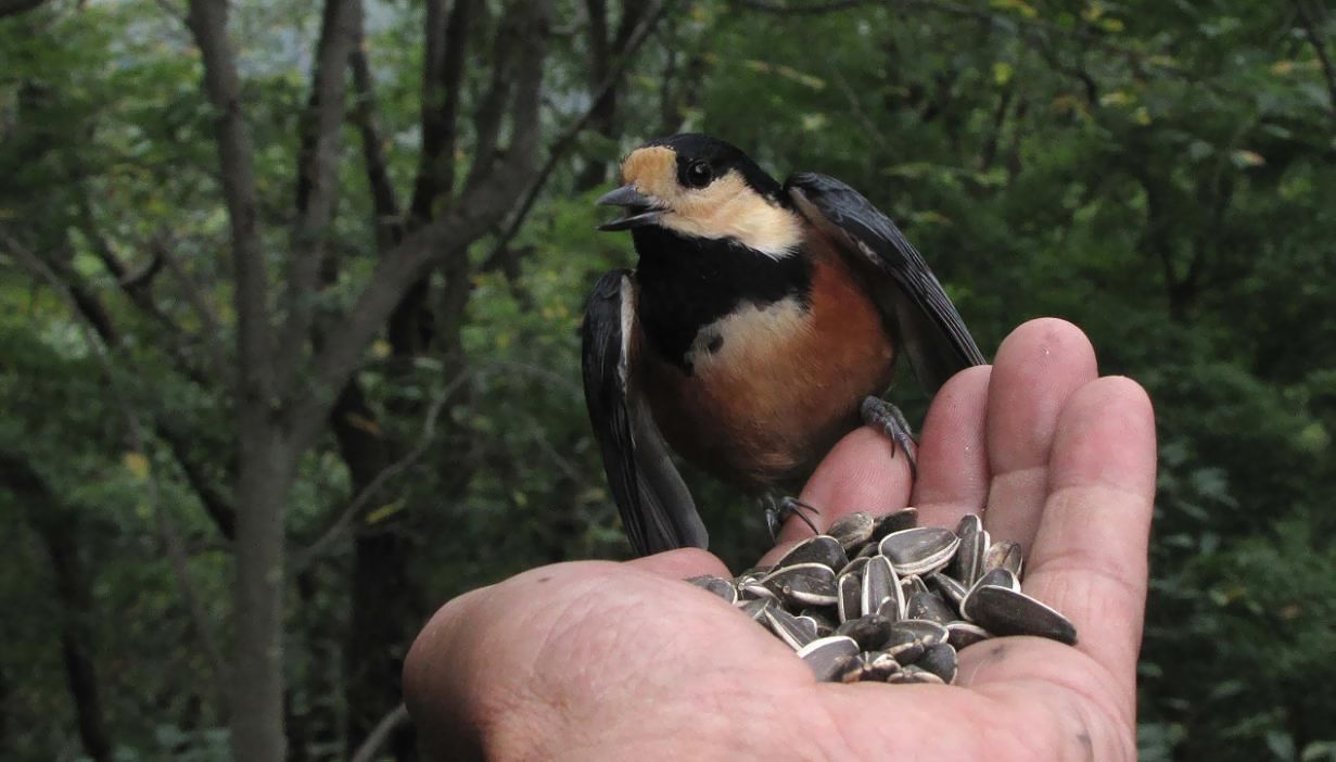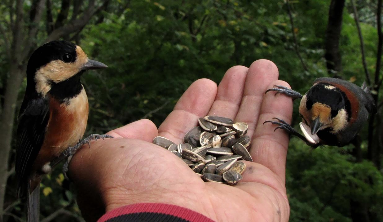 2月から餌付けをはじめ丸8ヶ月、シジュウカラ・ゴジュウカラ・ヤマガラなどが、代わる代わるやって来てヒマワリの種を食べてくれます。中でも、ヤマガラはヒマワリの種が余程気に入ったらしく、最初は2~3羽だけ来ていましたが、今では10羽くらいに数が増えて飛び回っています。