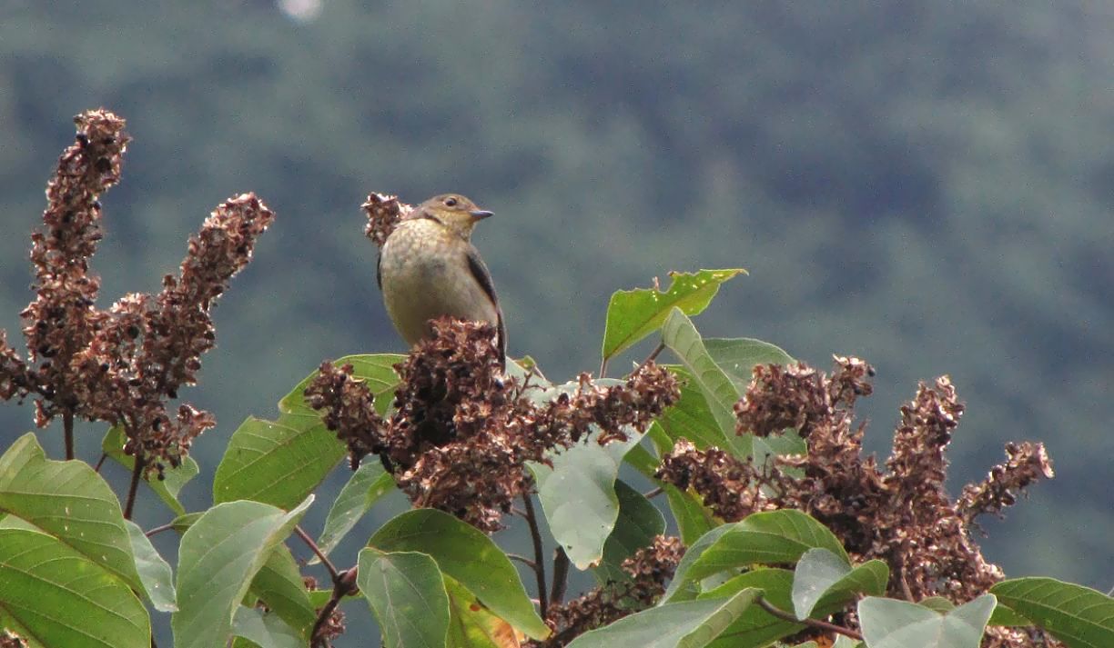 県民の森、アカメガシワの実を食べに来たキビタキのメスです。