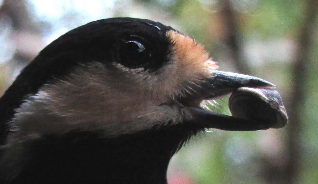 ヤマガラの顔です。友人達は多い時には12羽くらいが来てくれます。