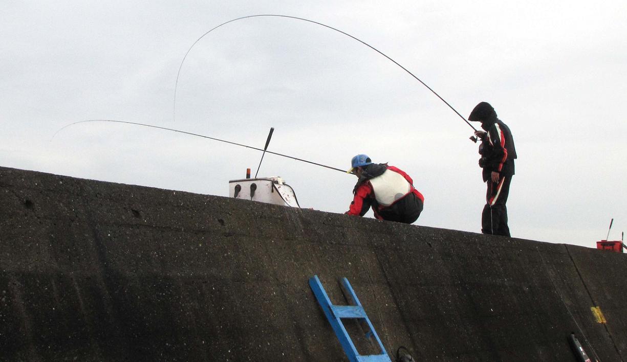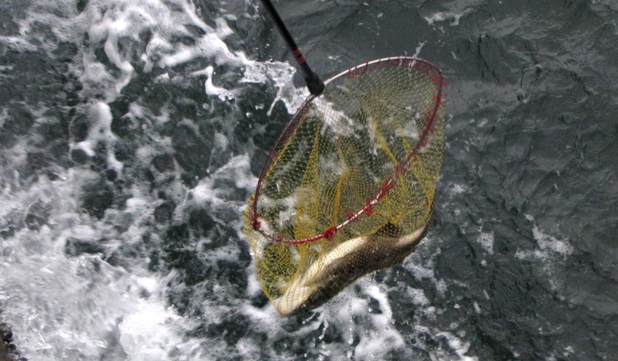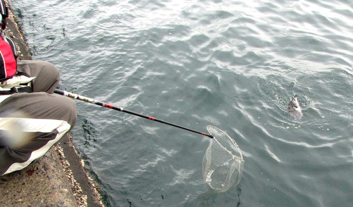 波がある時、犬走りの上からのタモ入れは高くて難しい