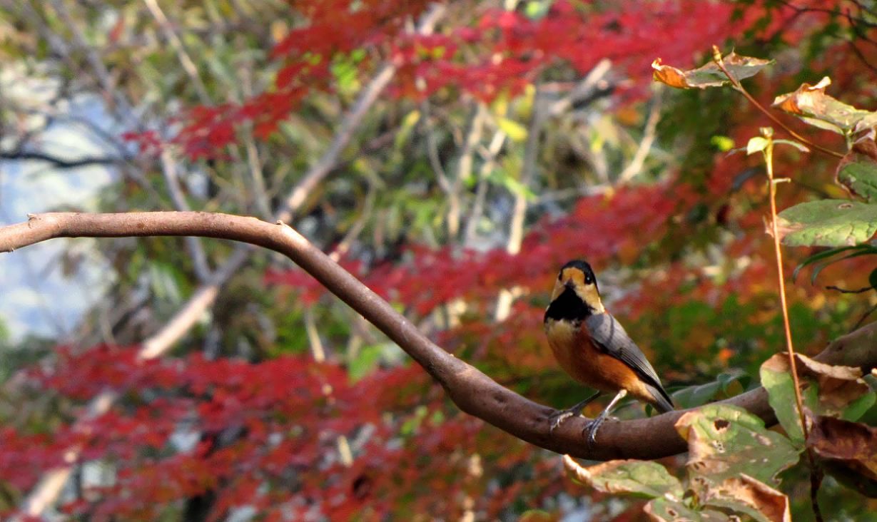 モミジが綺麗な色になっています。今の所2本だけですが、順次赤くなる事でしょう。ヤマガラ達は慣れているので、モミジをバックに色んなポーズ。