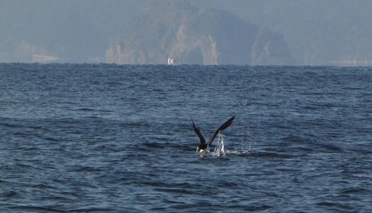 単独または小集団で海上を飛びながらダイビング、お魚さんを狙っています。この鳥のダイビングは、写真の様に垂直に飛び込んだり、水平に近い状態からでも、矢の様に突っ込んでいます。