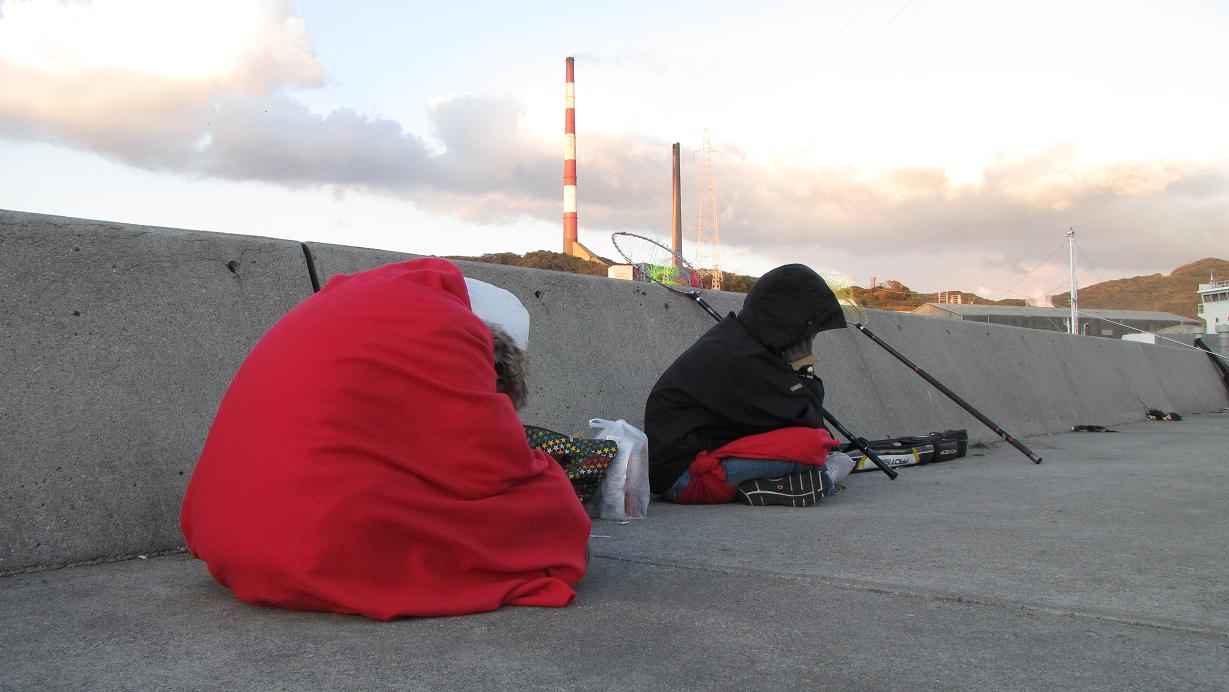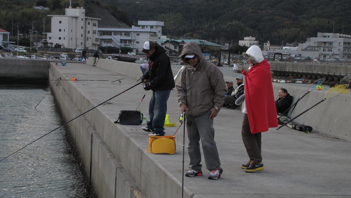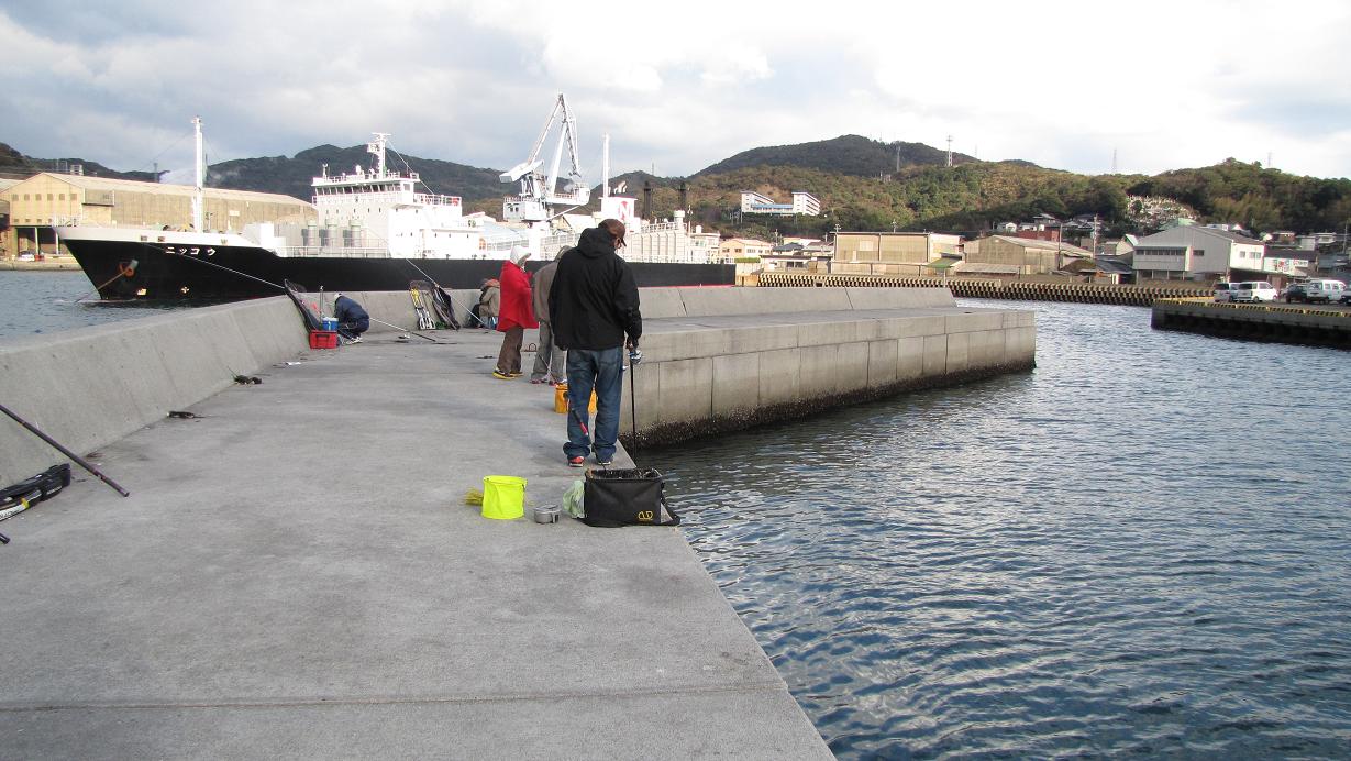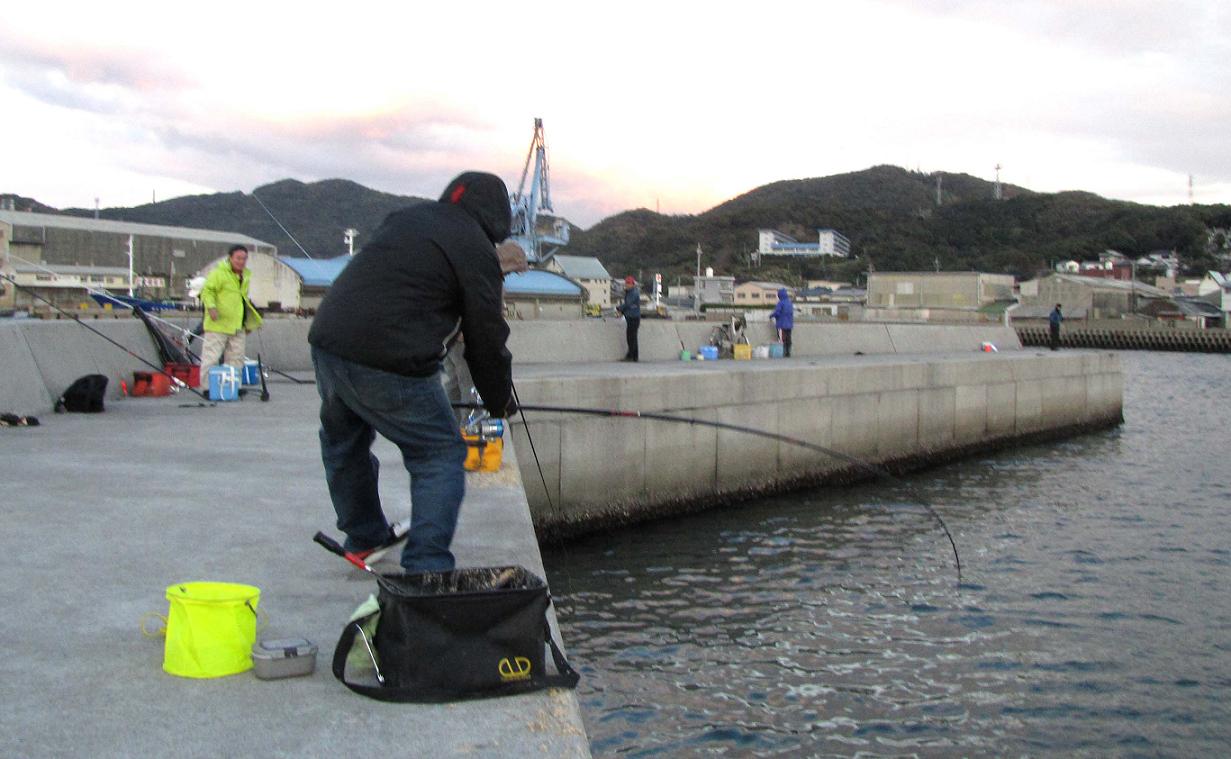午後一番から俞さん一行と合流し、風の強い一文字には行かず、佐賀関の消防署裏の防波堤へ、カンダイ狙いで4人を案内してあげました。14時過ぎから17時過ぎまでの短期決戦、ココにも大型のカンダイは居ついており、男二人がカンダイに挑戦です。