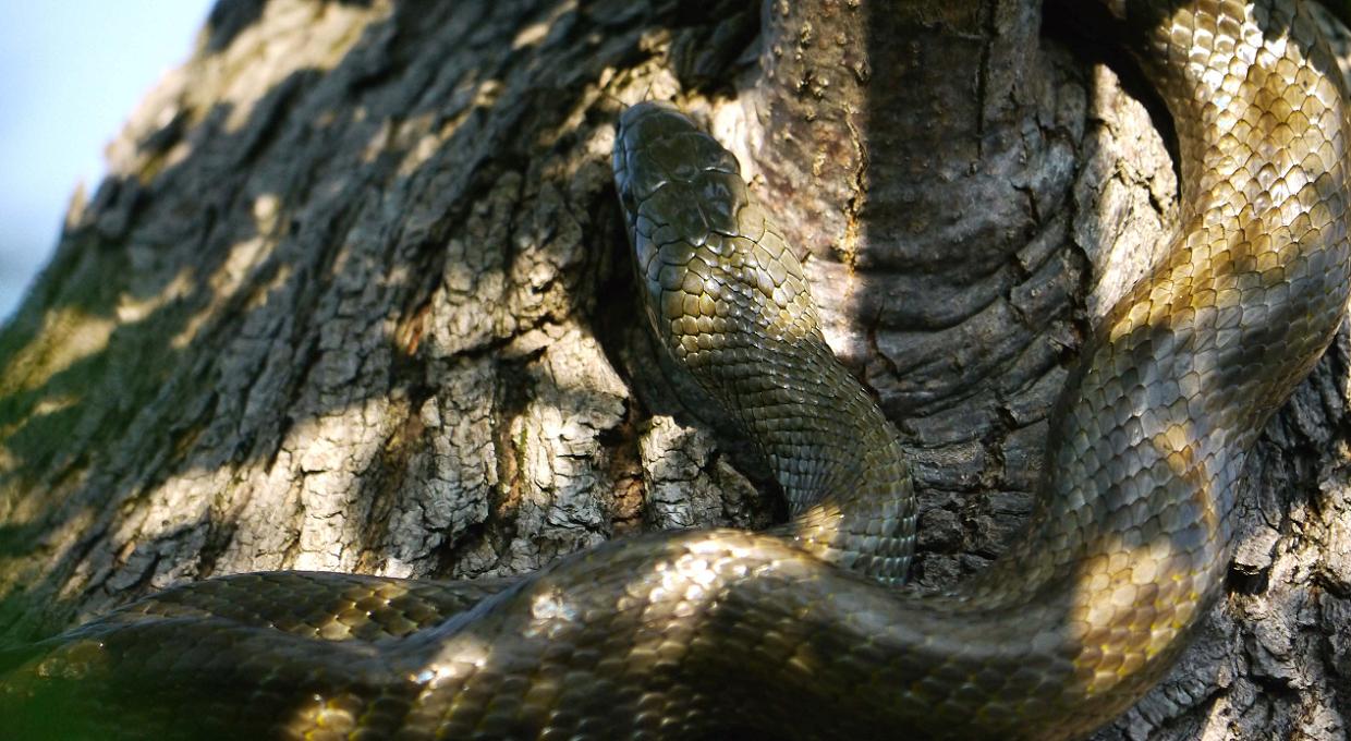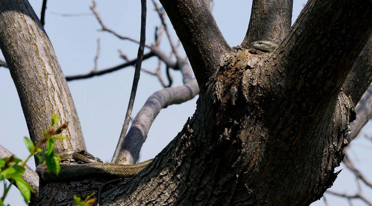 この青大将は、木の穴を住処にしており、出たり入ったり。