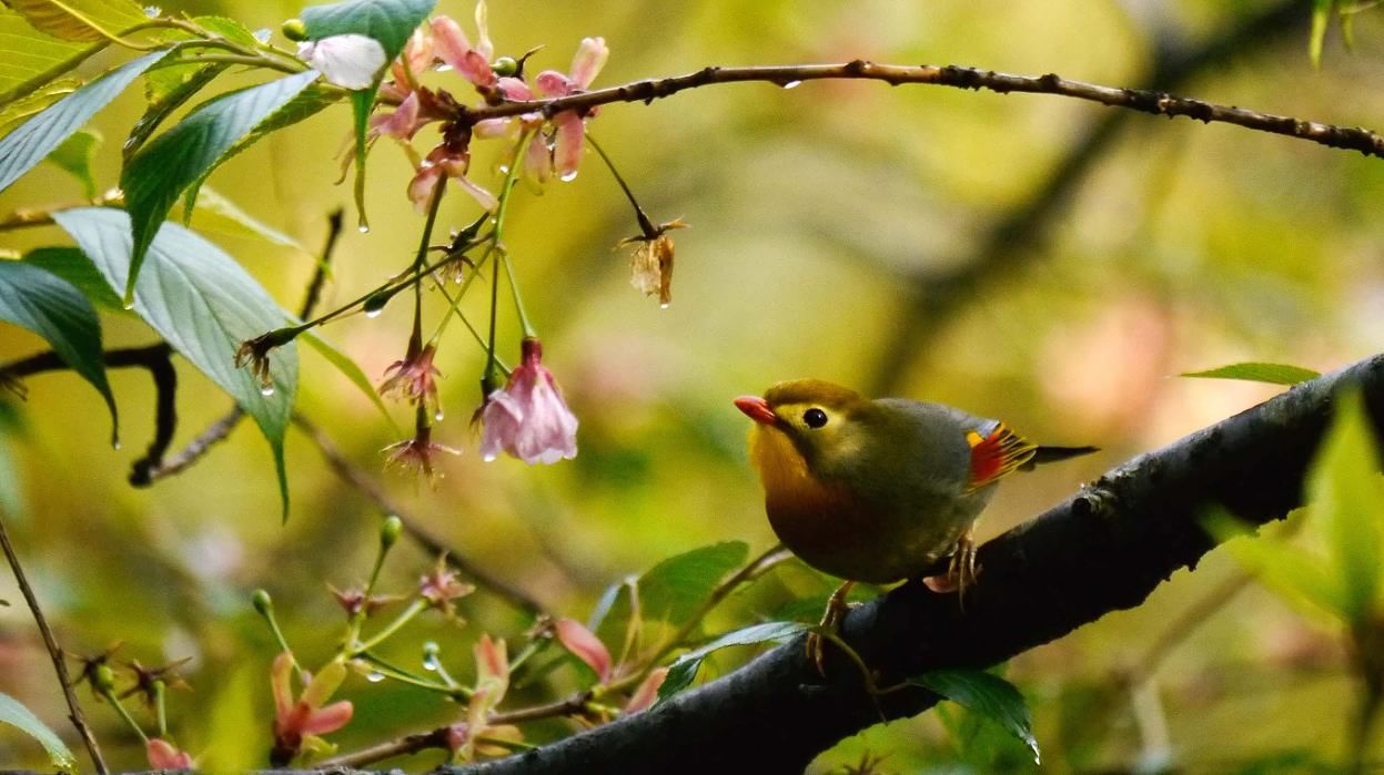 傍の桜をテリトリーにしている、特定外来種のソウシチョウのオス