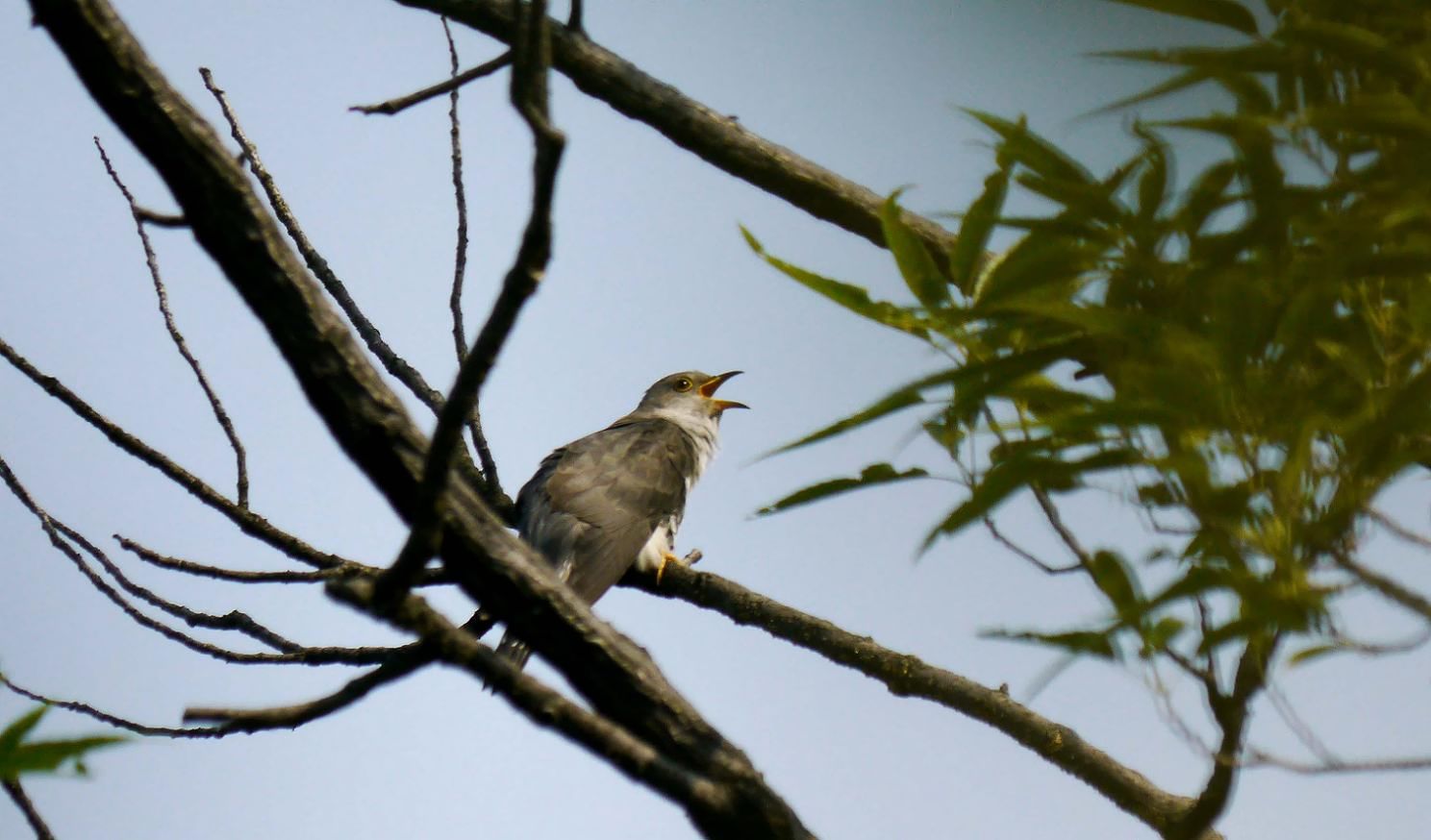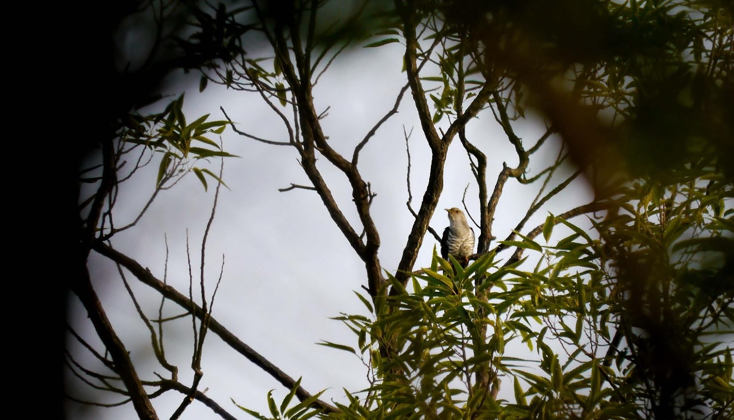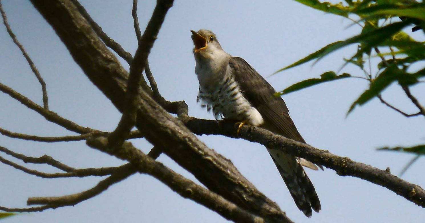 山の頂上付近や、尾根の木の茂った枝に入って鳴くホトトギス。