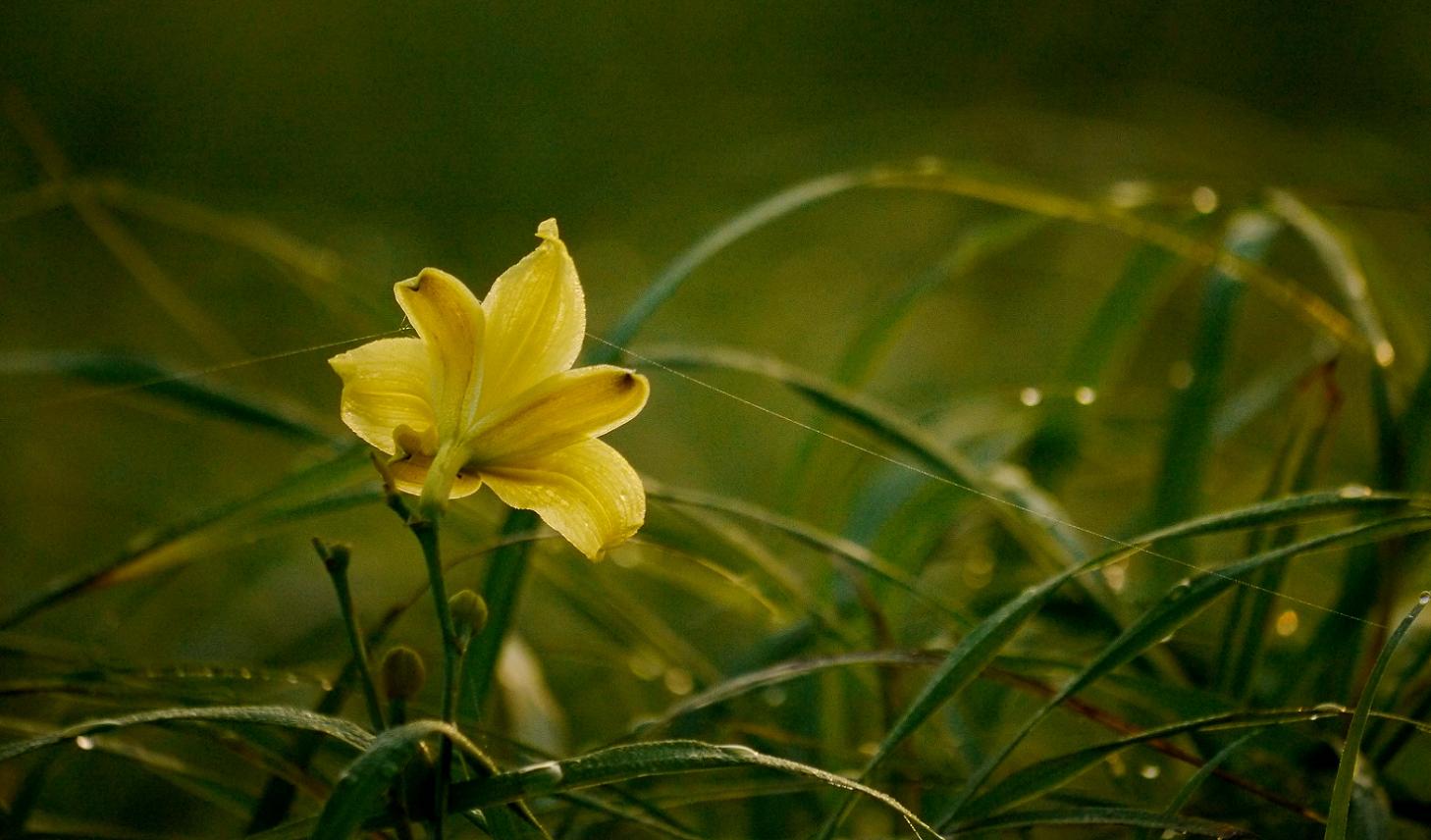 狙いはユウスゲの綺麗な花に留まるコジュリンの姿。