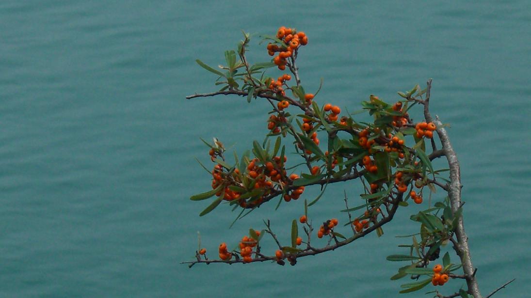 あとはお決まりの撮影。海をバックに写した中のピラカンサ。赤と橙の2種類が野生化していた。ピラは棘の意味があり、カンサは赤の意味だったと記憶している・・?