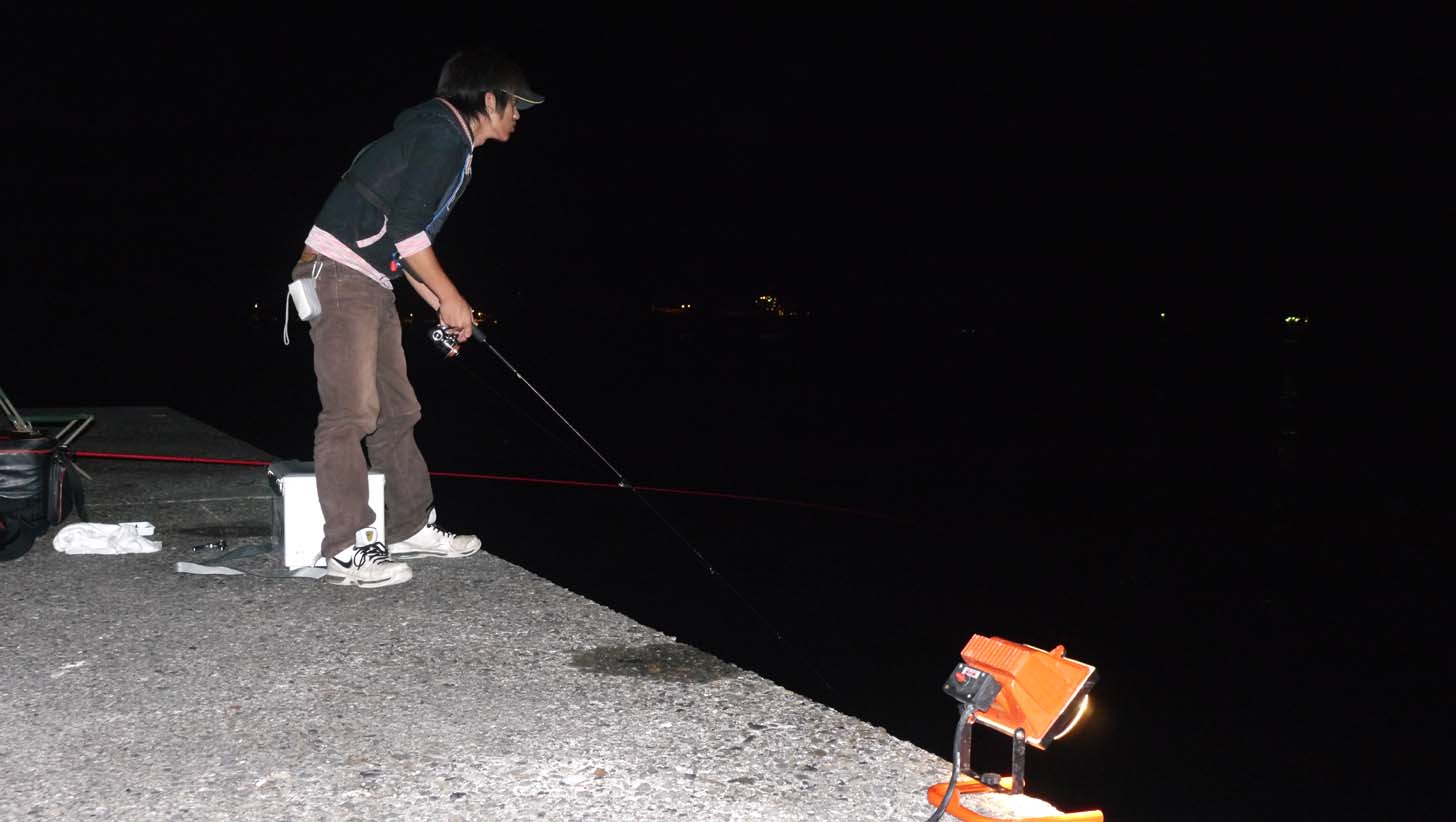発電機を持ち込み、投光器で海中を照らし、ついでに足場周辺にも照明を点けて釣り開始。エサのキビナゴを取り付けて投入すると、3投目からアタリが出ましたが、なかなかハリには掛かりません。