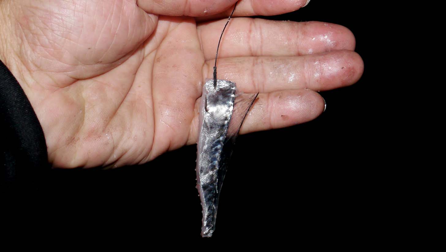 釣れたタチウオの切り身は光るのでアピール力が強い。皮が強いので、キビナゴに比べると断然エサ持ちが良い。食い込みが良い。などのメリットがあるのです。