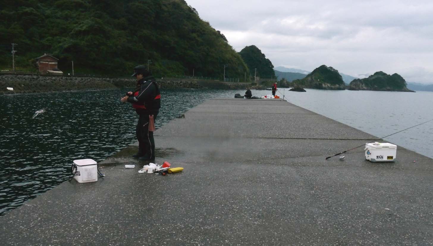この波止は沖磯に負けないくらいグレが釣れます。エサ取りにスズメダイ・ネンブツダイ・タカベ・アジゴなどが多く、オキアミでは歯が立たない事が多いのですが、オタスケマン的な釣り場で好きな場所です。