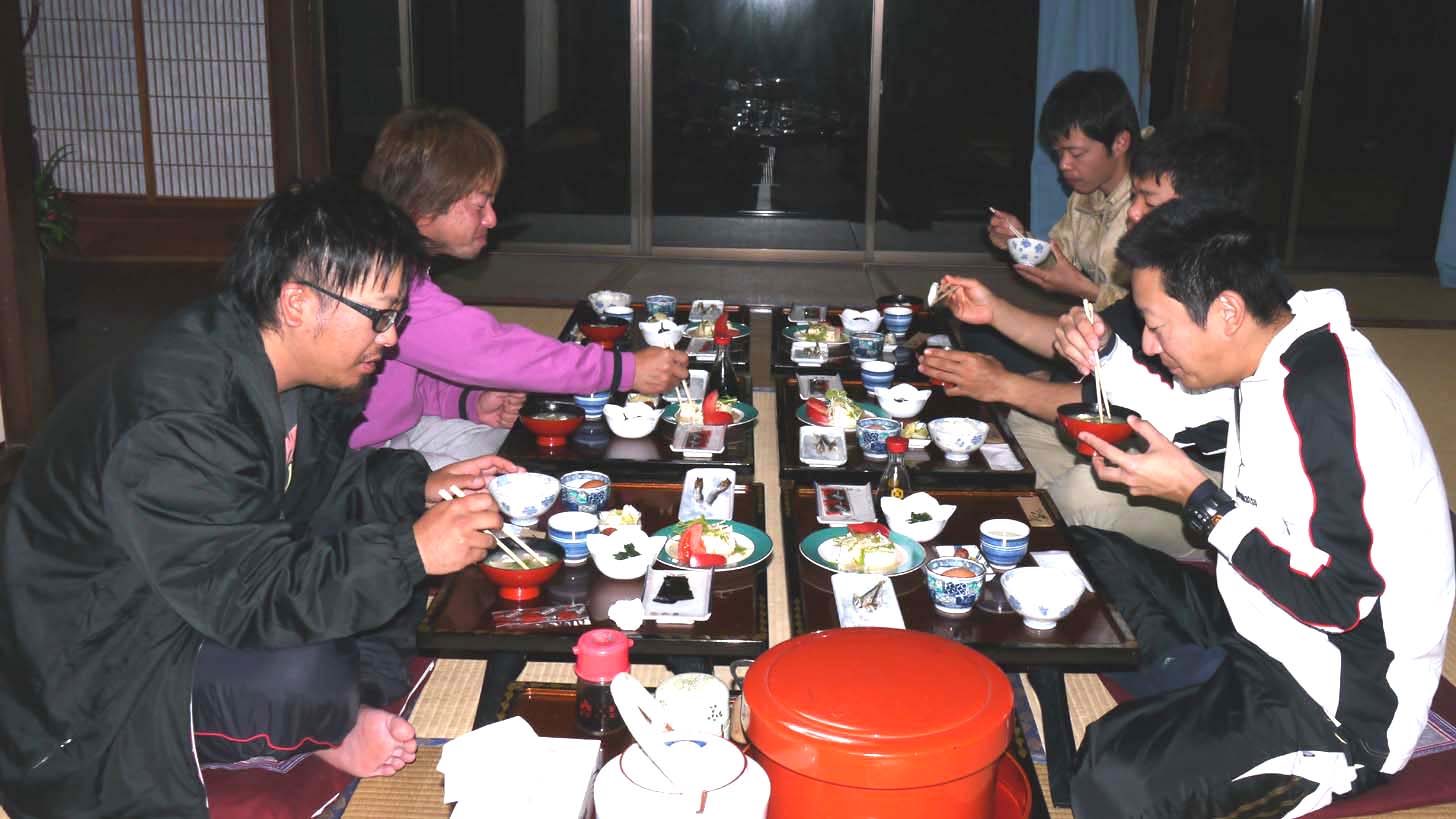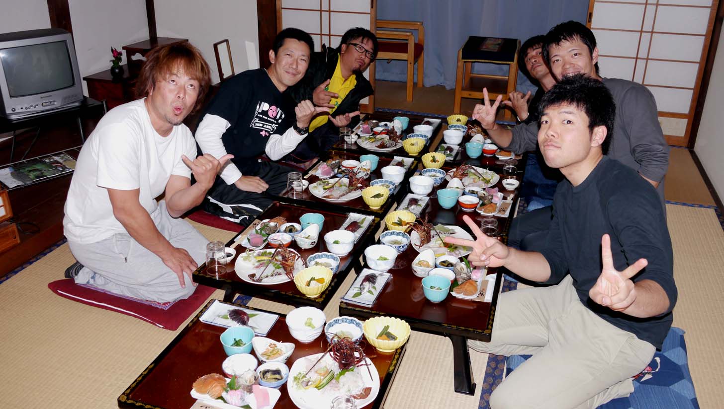 今回はモンパチのサッシーと、北九州から黒ちゃん・ケンちゃん、大分からはヒデちゃんが参加、がまかつの2名も参加しての食事です。