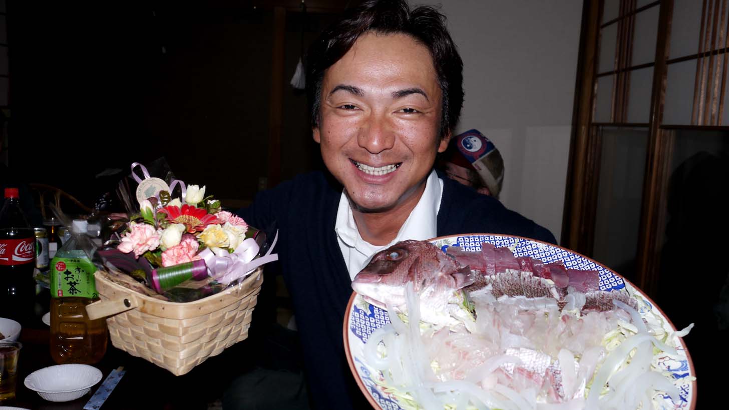 今回はたまたま?G杯で優勝した猪熊君に、YY女子部と野人から花とマダイのお造りプレゼント。一足早いミニミニ祝賀会も・・。