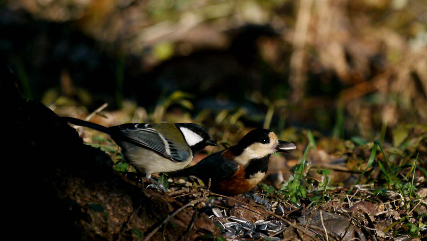 餌場にやってくるシジュウカラとヤマガラ