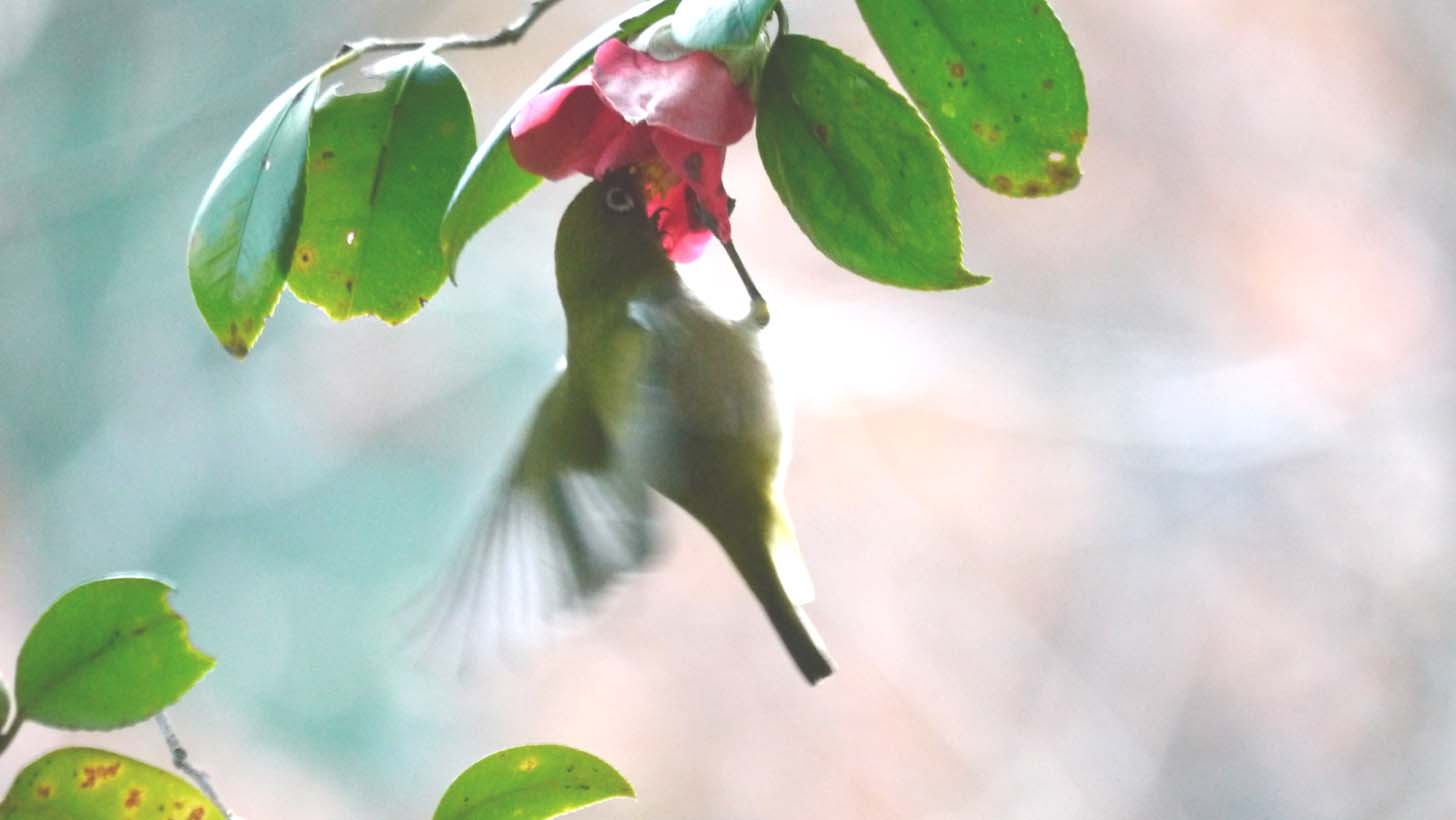 冬の風物詩、ヤブツバキの蜜を吸うメジロ