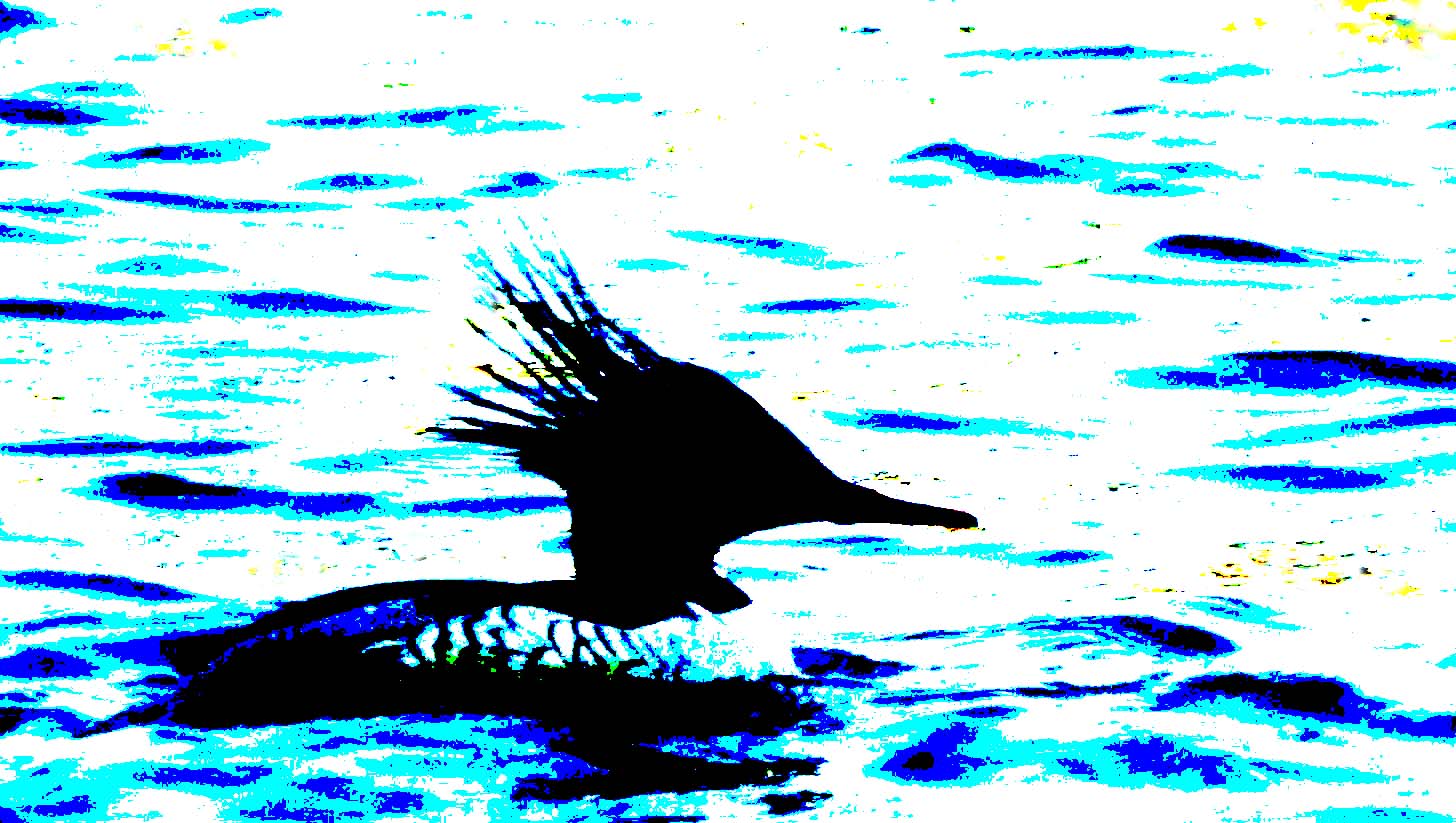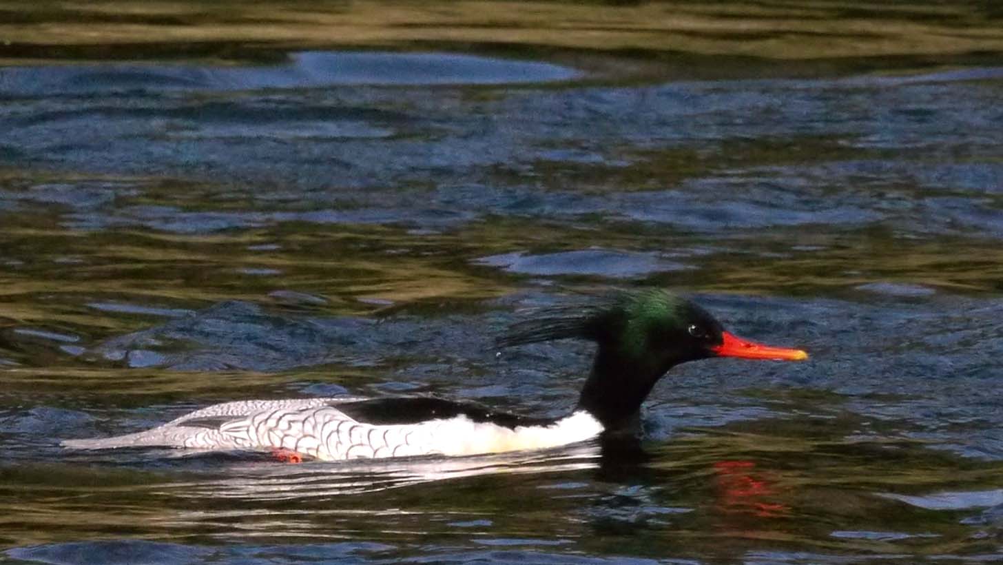 カワアイサはノッペリ頭、嘴の先が曲がっている