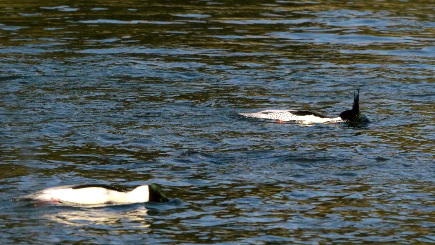 アイサたちがやってきたのは10時頃、上流から水中を見ながら下ってきました。顔を上げるのは息継ぎの短い時間だけ、3羽ほど撮影しましたが、通過したのは1~2分という短さで、こちらを全く気にせずに、スイスイと通り過ぎてしまいました。