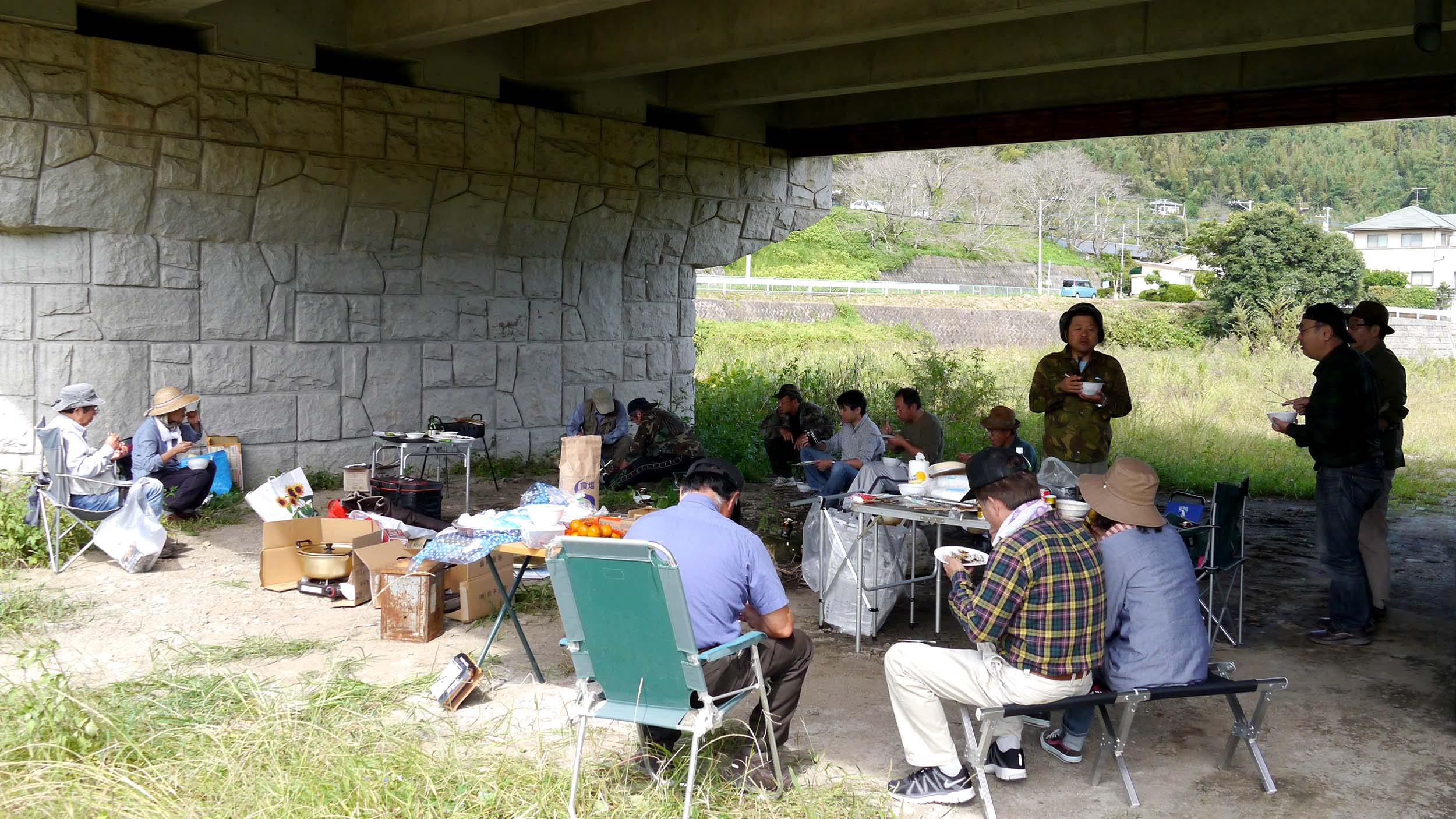 昼は全員が橋の下に集まって、美味しい秋の食事。