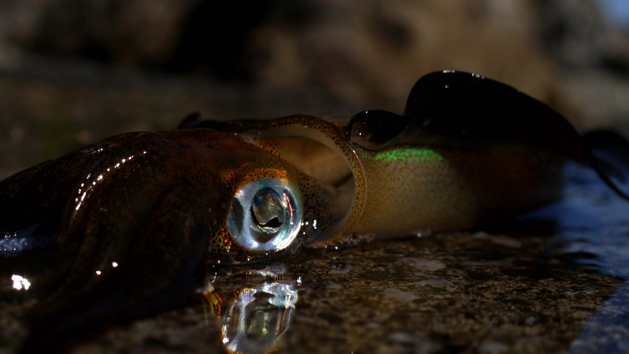二人でのタッグで、エサを抱いているアオリイカをタモ入れ