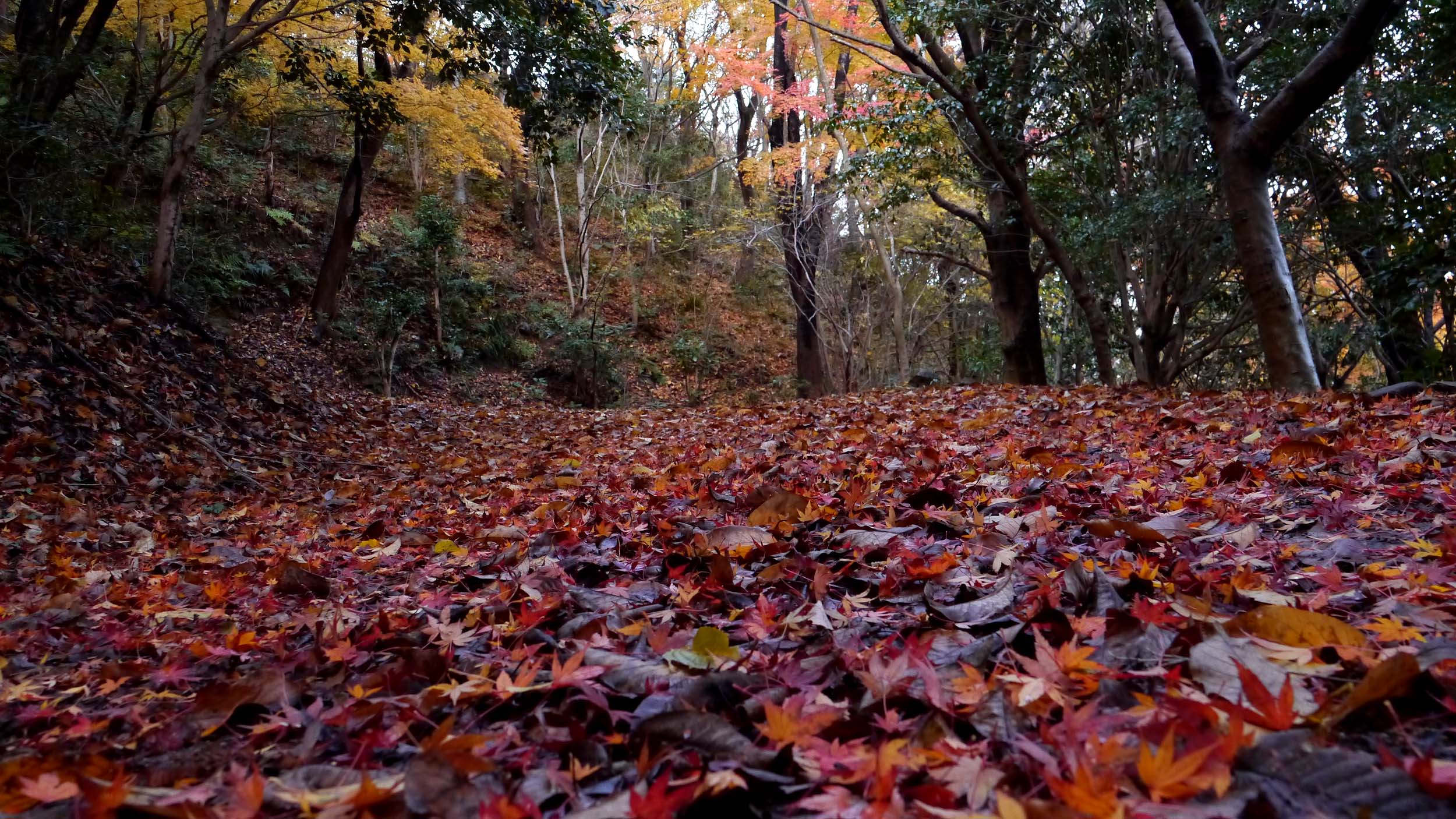 山道では、舞い降りた葉っぱが積もり始めている所も・・。