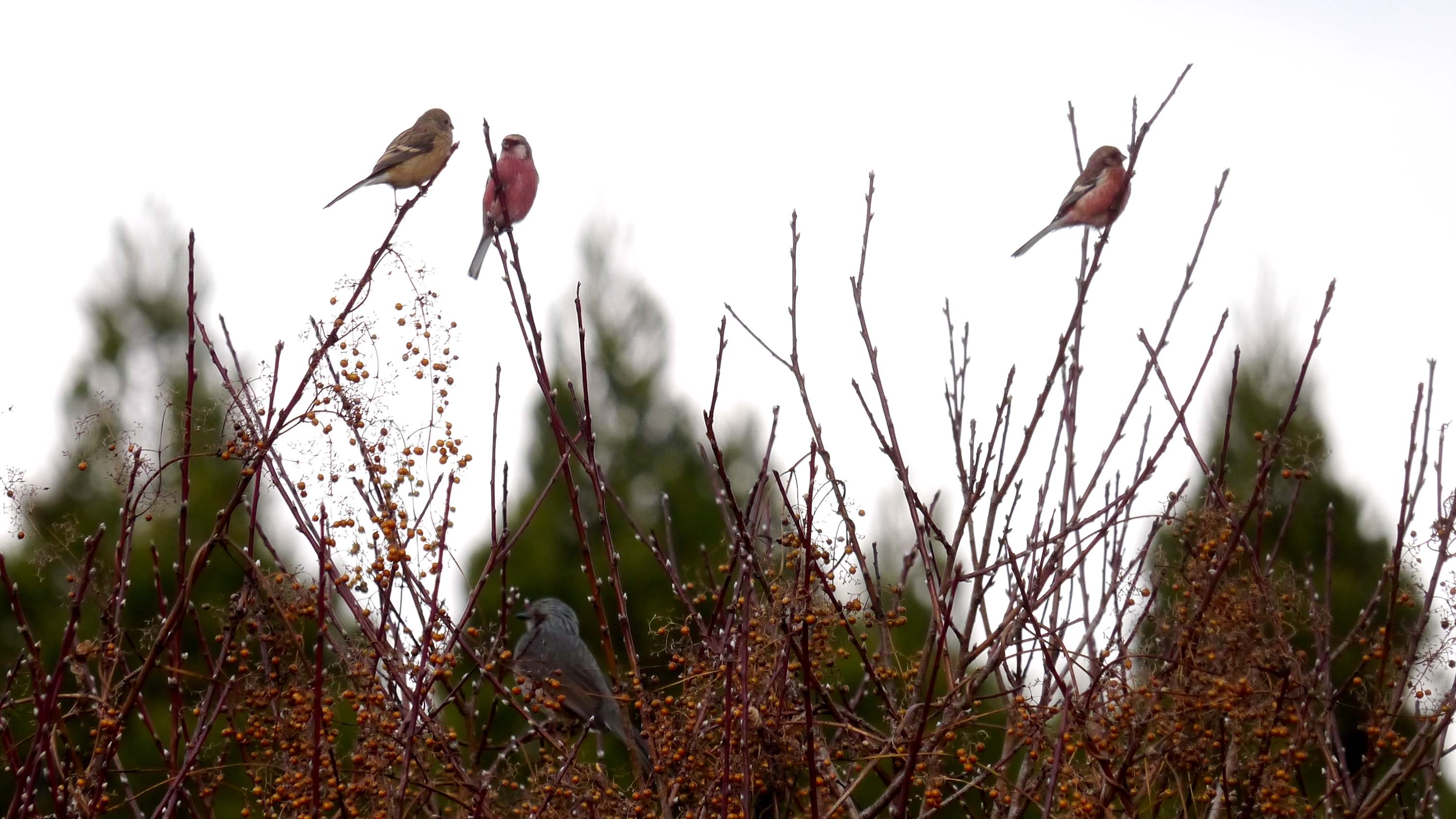 綺麗なオスが2羽とメス、下にはヒヨドリ
