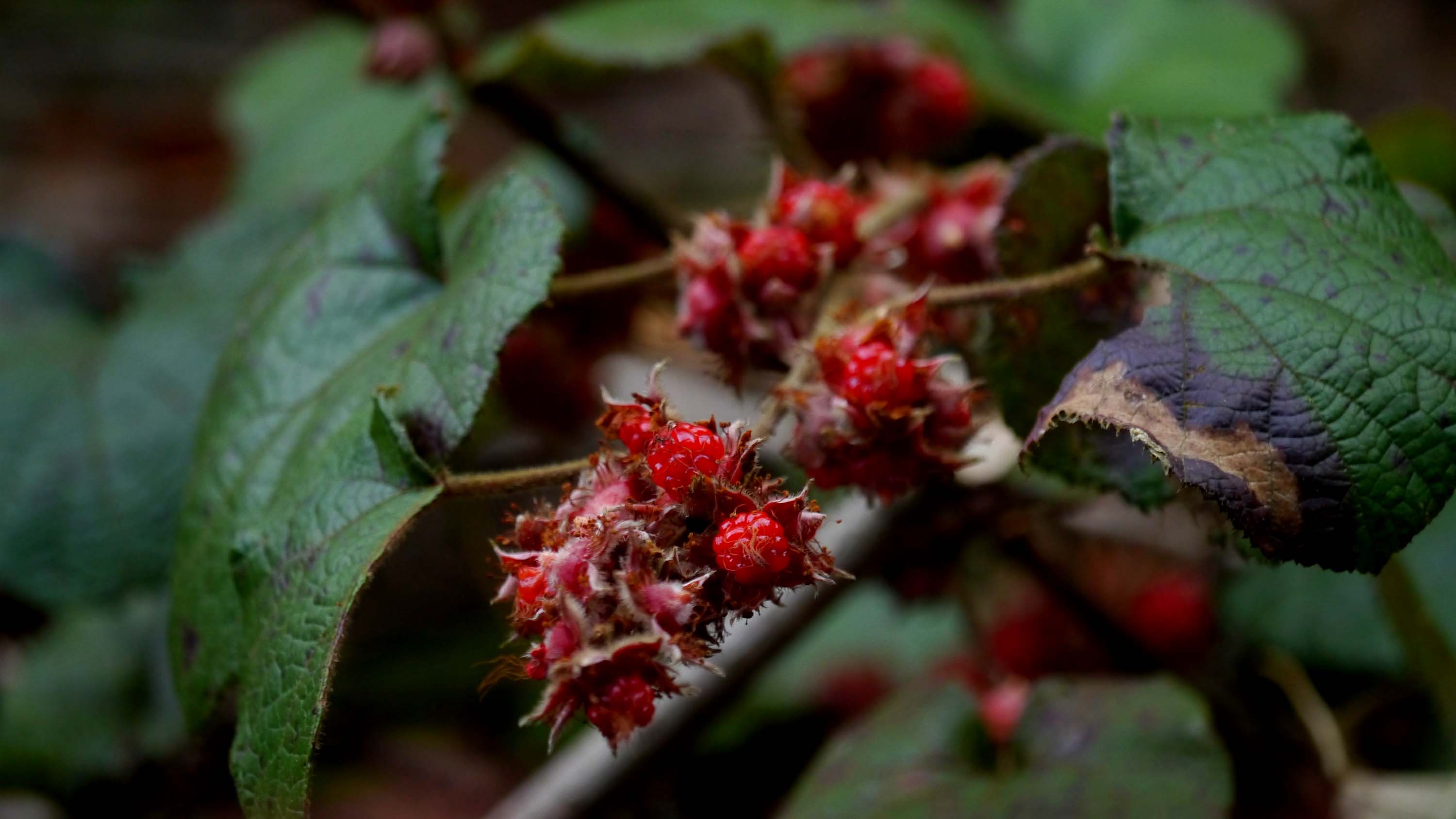 小さな赤い実を着けている、フユイチゴに出会う機会が多くなりました。
