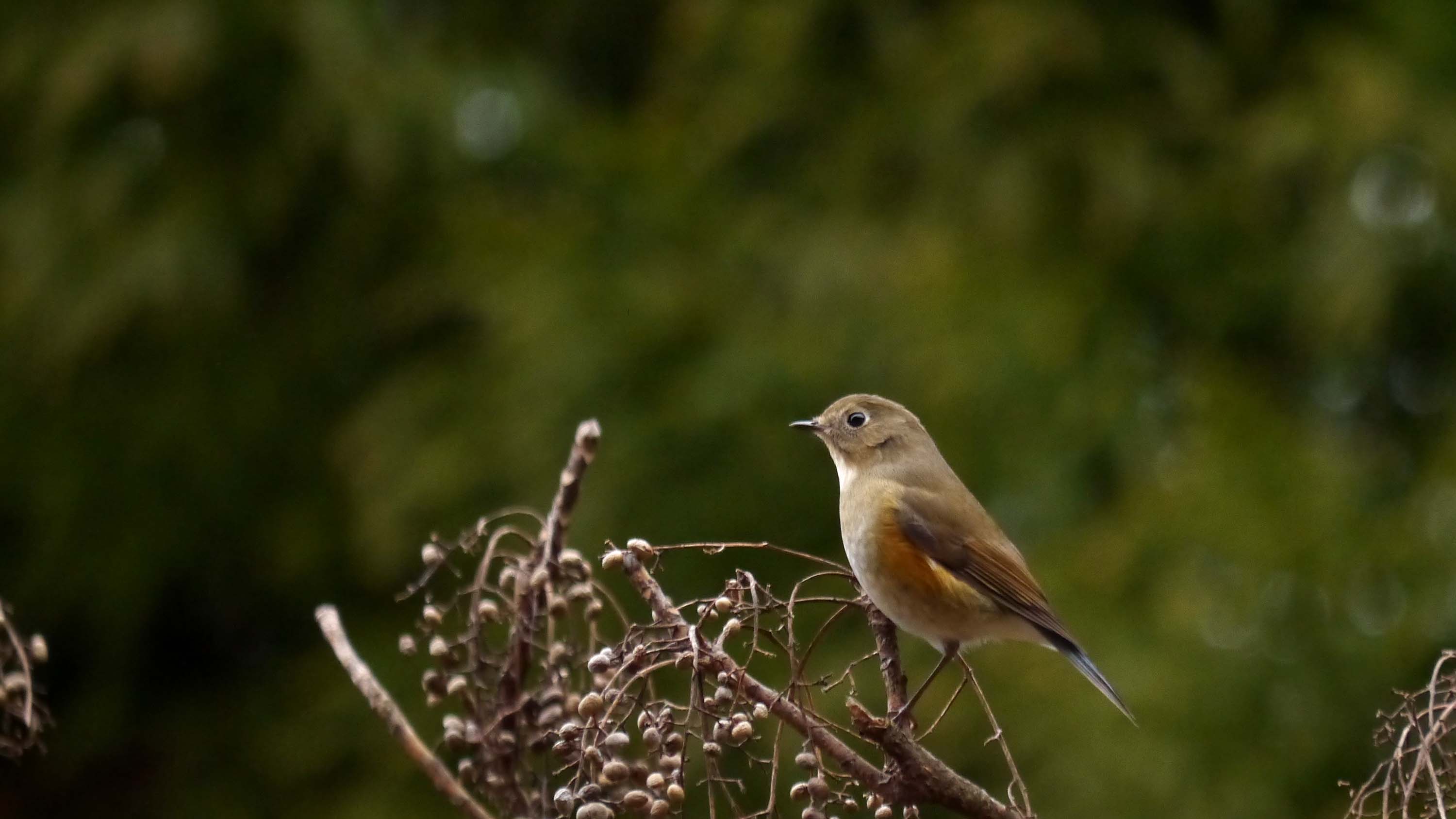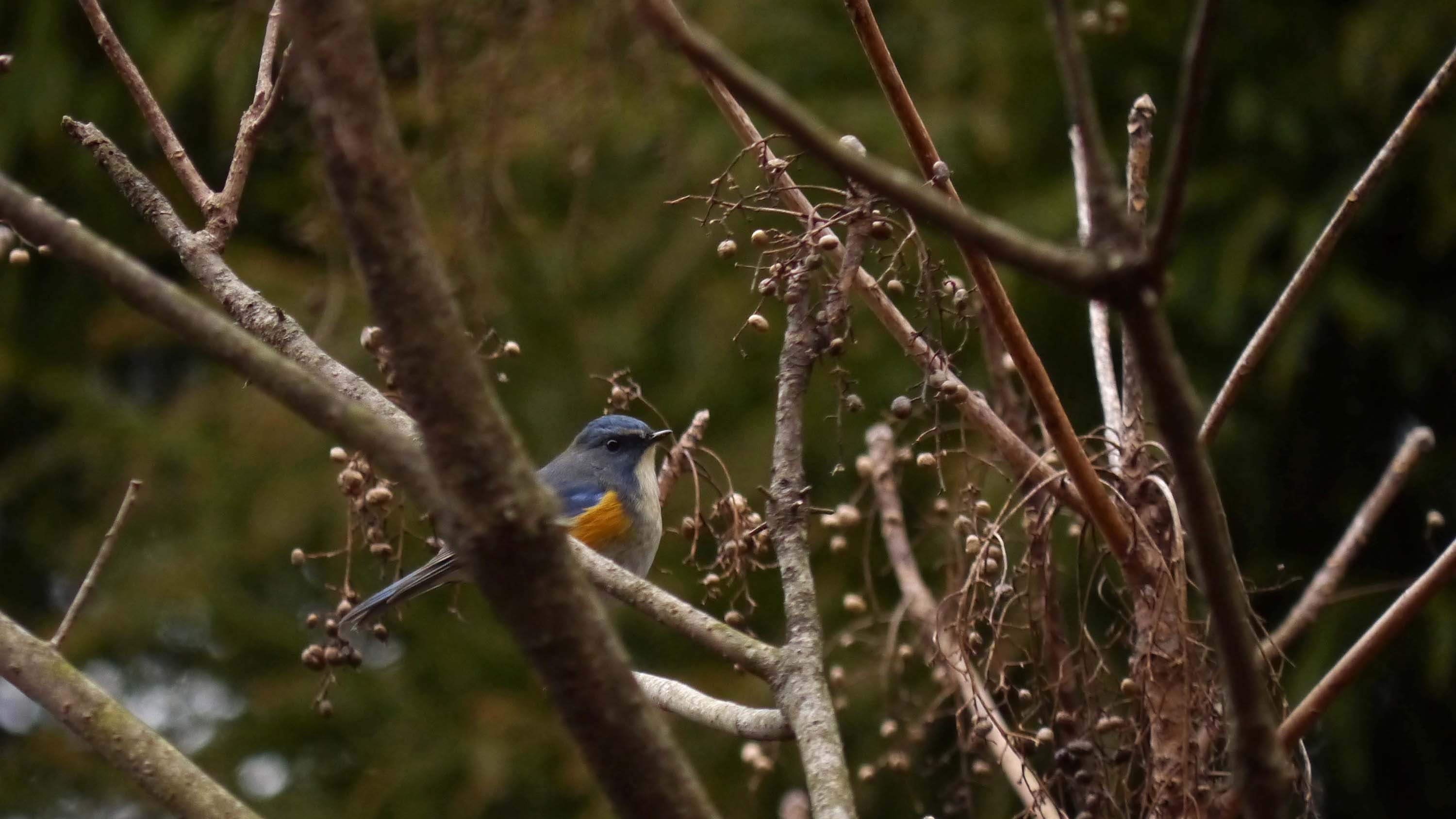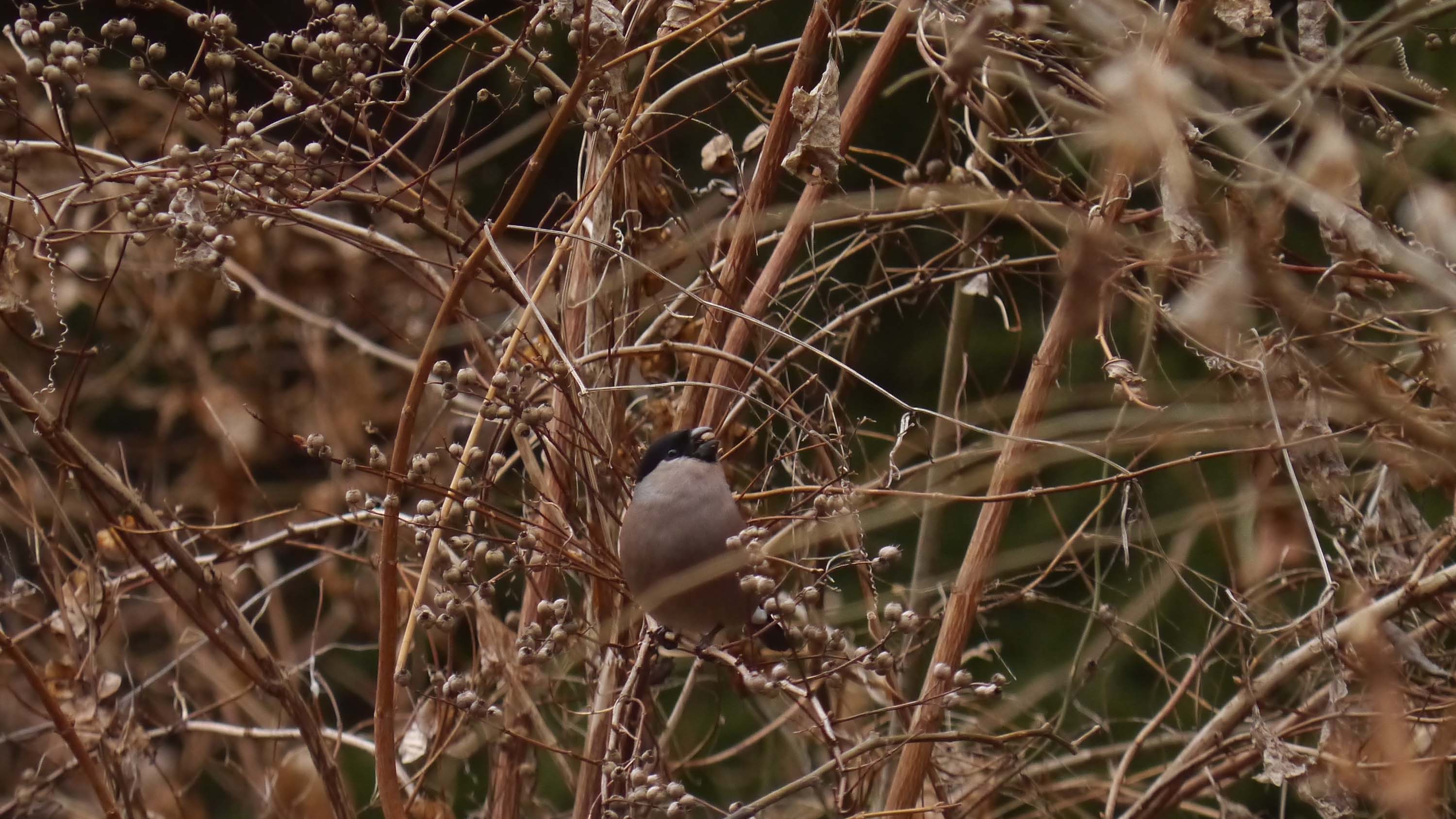 戻って、奥のカラスザンショウの手前にあるハゼの実は、少し残っていたのでチェックすると、ルリビタキのメスが3羽、オスは1羽、ジョウビタキ・ヤマガラ・コゲラ・シジュウカラ・メジロなど。その下の藪では2~3羽のウソも来てくれました。