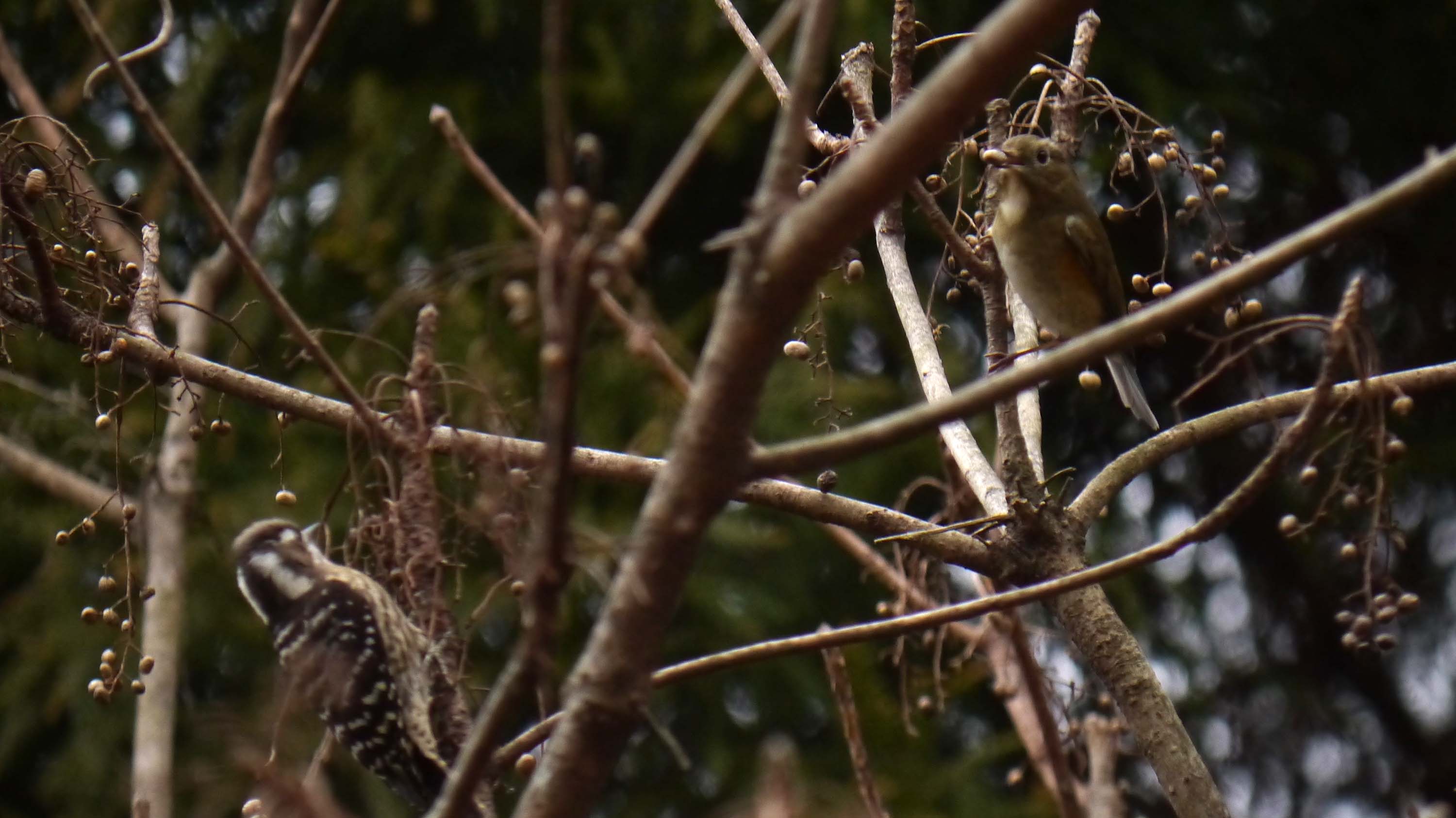 ルリビタキのメスとコゲラ