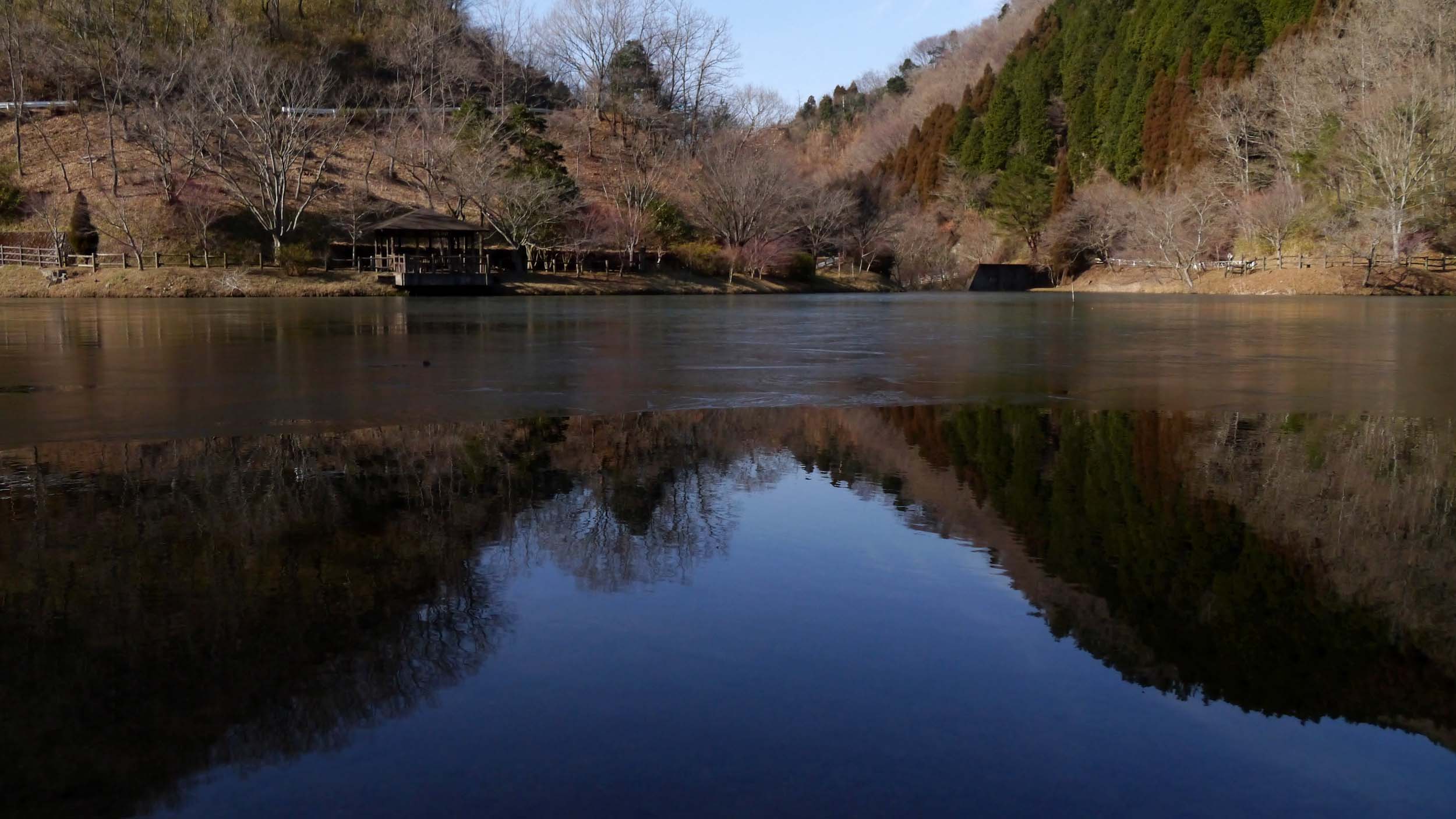 県民の森の池も薄く氷が張っていました。