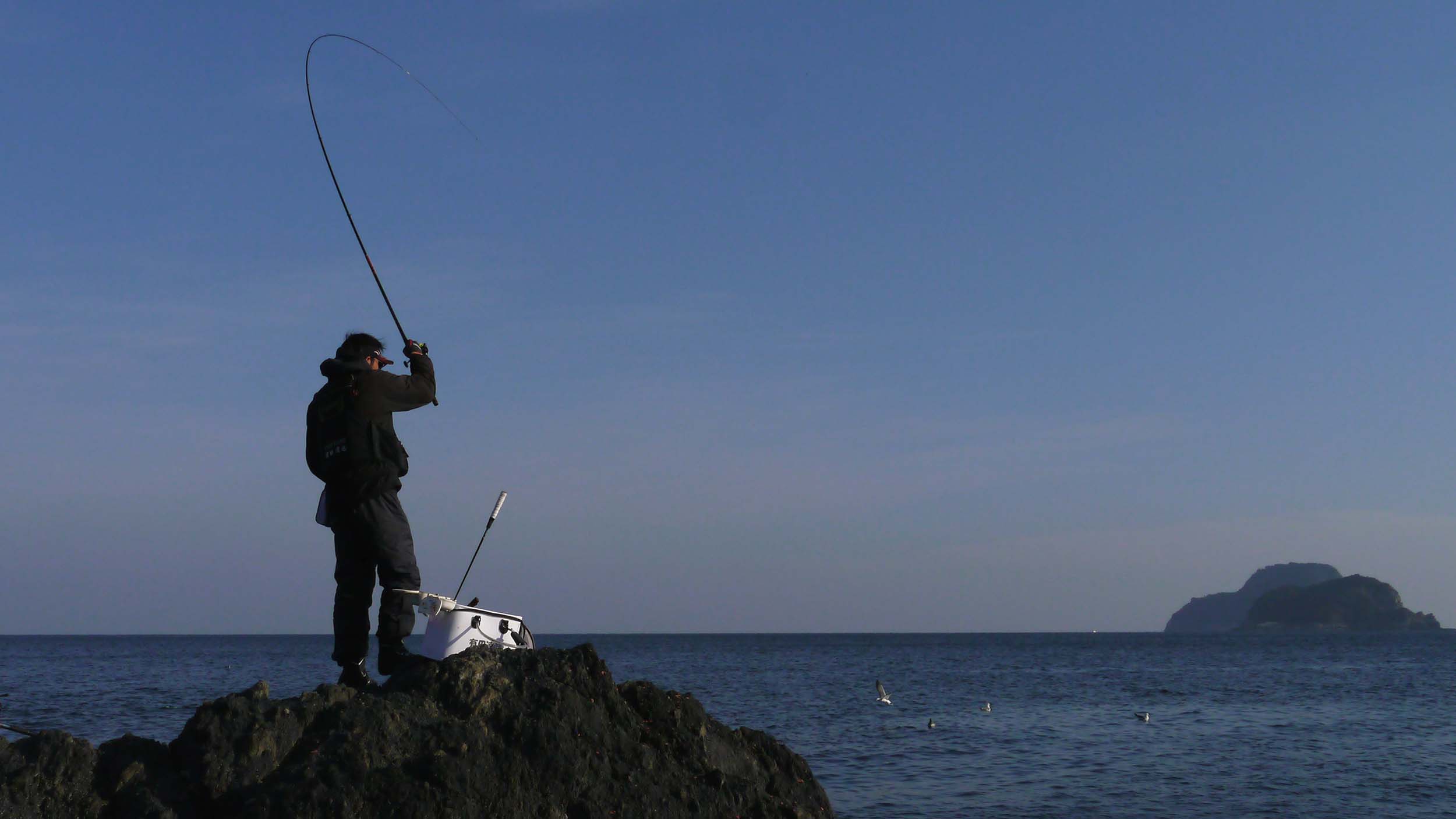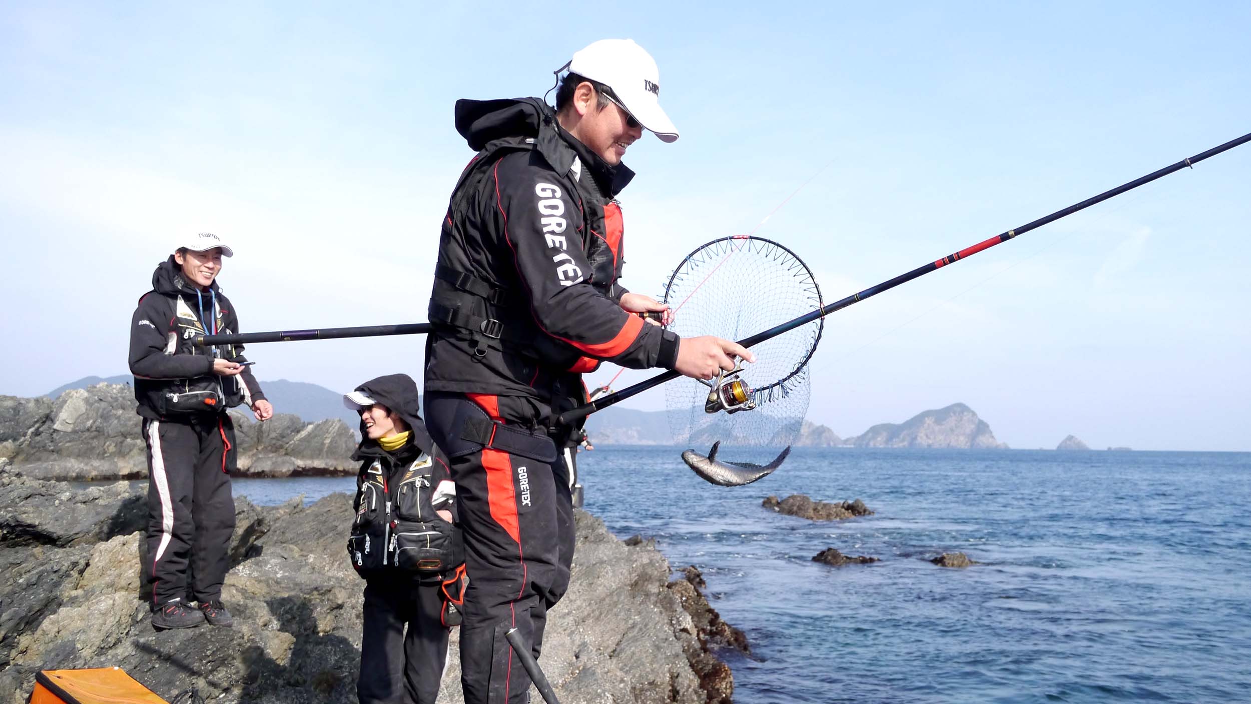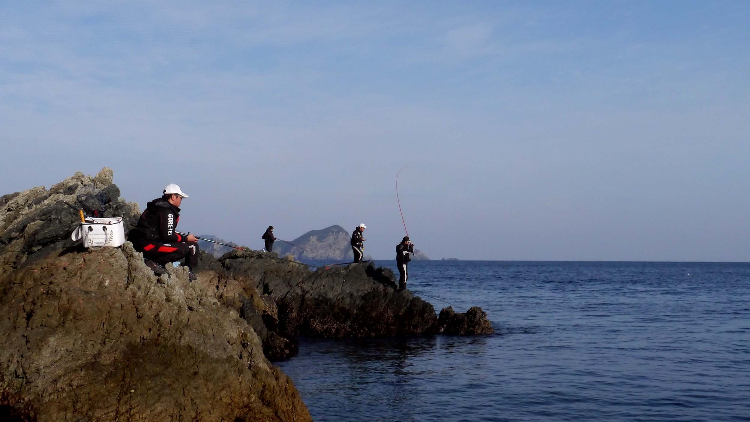 釣研FG東九州支部の決勝大会で、最後の戦いに進んだのは牧・利光・有田君ら3人。戦いの舞台は“押出の鼻”で対戦時間は14時から16時という、大分県の冬の磯ではゴールデンタイムの時間帯です。