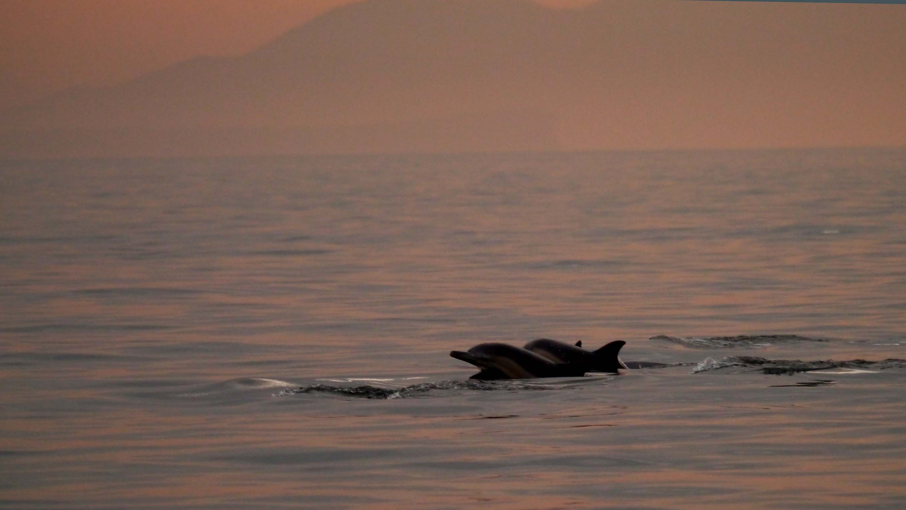 大分ではイルカを結構目撃しますが、香港では出会うことはとても少なくて、見ても1~2頭を年間で数回ほどだとか・・。そんなイルカが朝日を受けて、20~30頭くらいの群れで、ゆっくりと泳いだり跳ねたりしており、壮観な眺め。