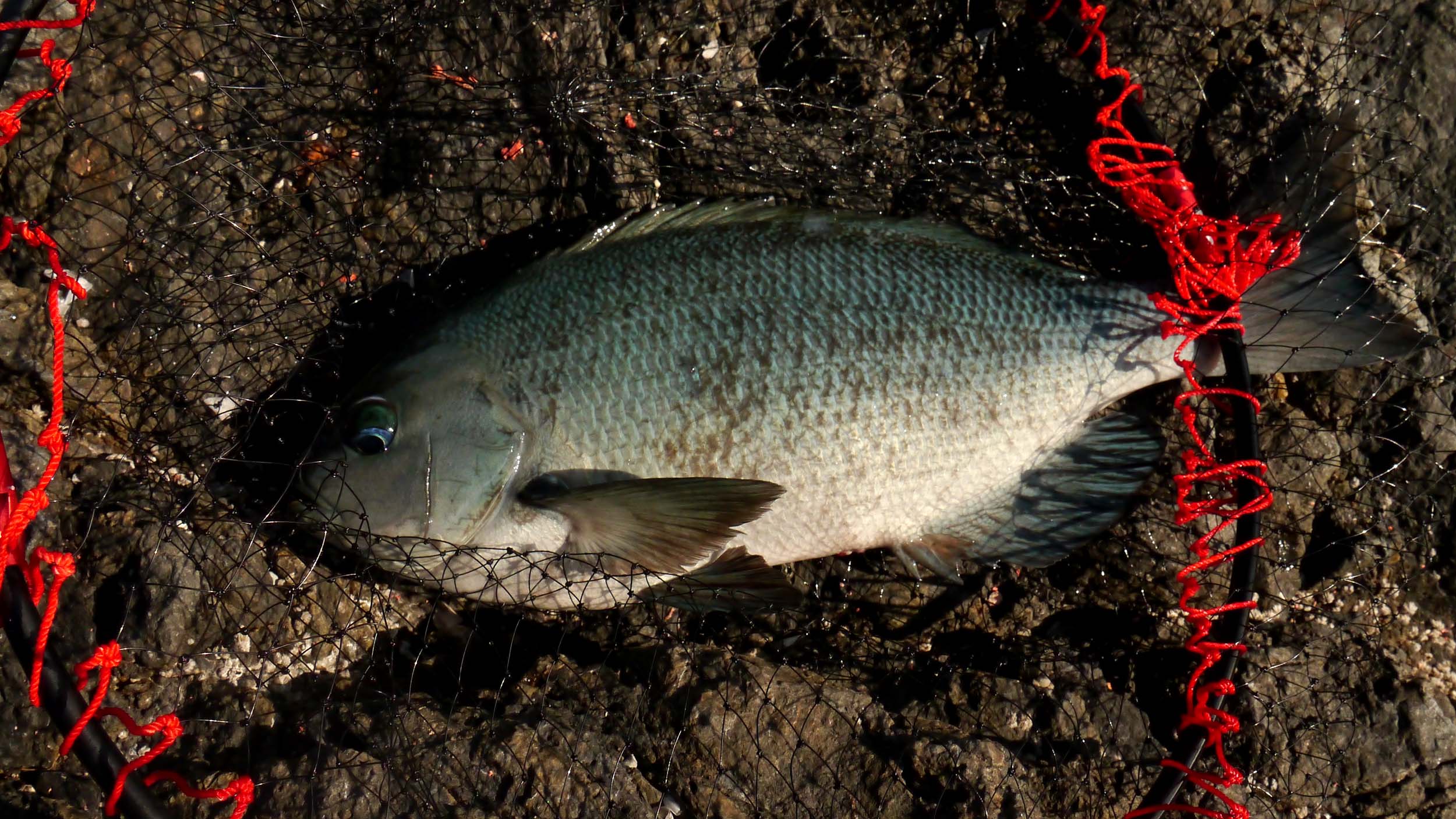 12時からは“千畳敷”での釣りでしたが、3ヒロ~竿1本半くらいのタナで、道糸を引っ張るアタリです。30㎝級を2枚リリースし、40㎝くらいから47㎝位のグレを5枚ほど取り込むことが出来ました。