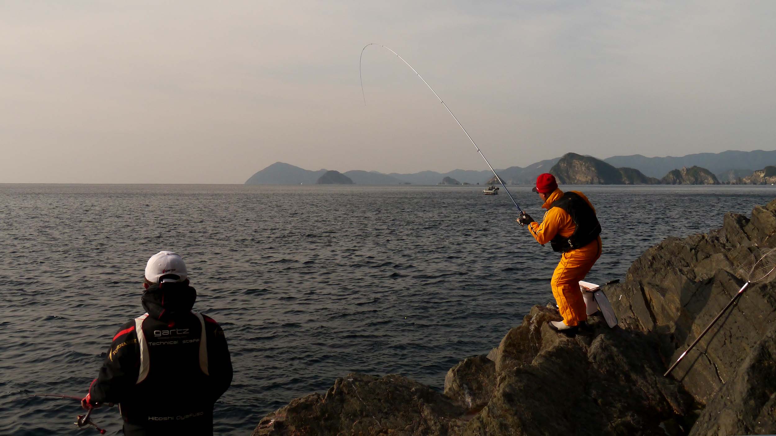 まずは鶴見の"テッポウ”へ5人で上がって、グレやイシダイ・カンダイ・イスズミなどを釣りました。正午の瀬替わりで、サッシーや木村君の本体に本命潮が流れる“テッポウ”を譲り、3名になった私たちは“押出の大バエ”に瀬替わりです。