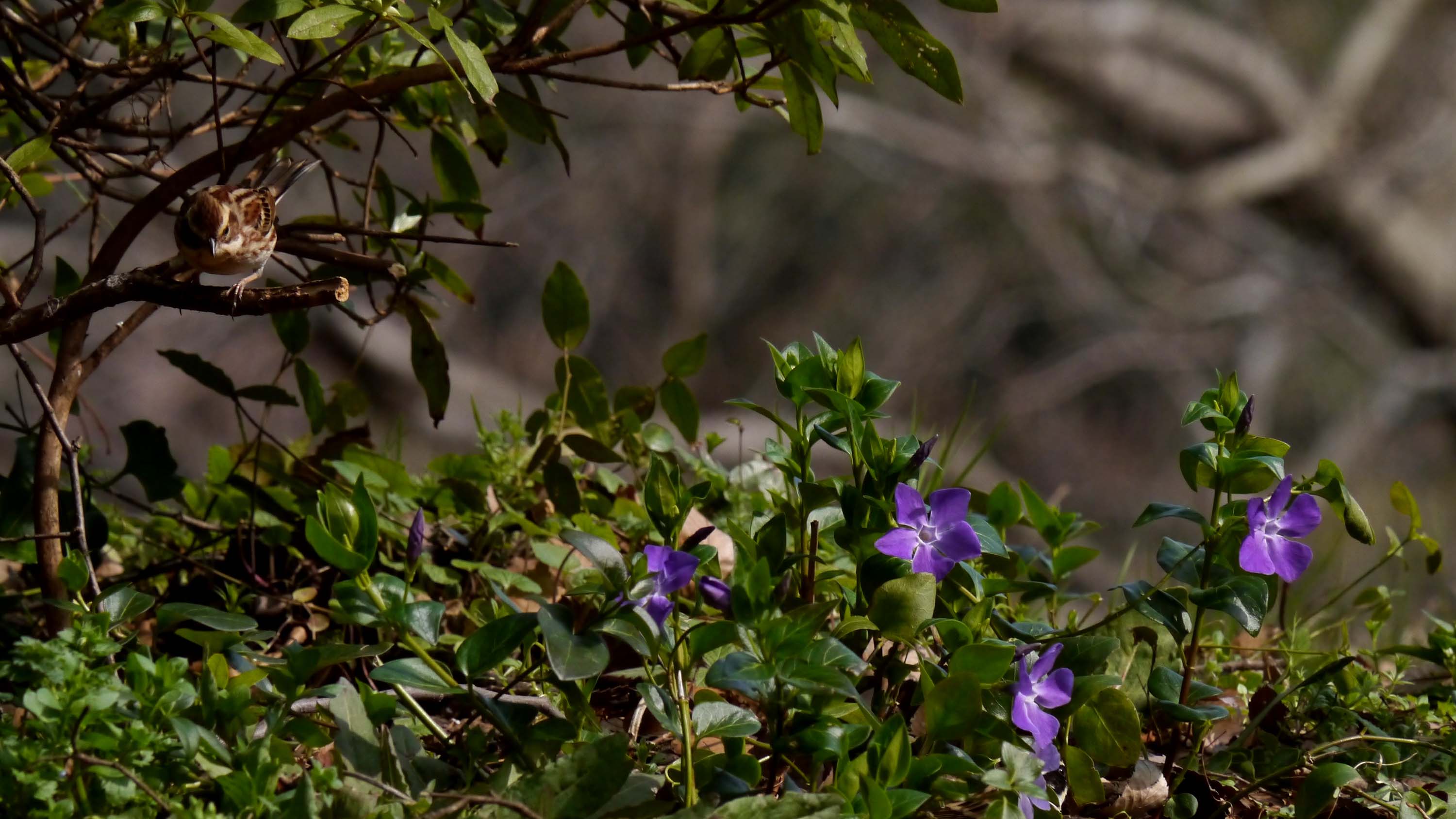ヤマガラハウスに咲くツルニチニチソウ。