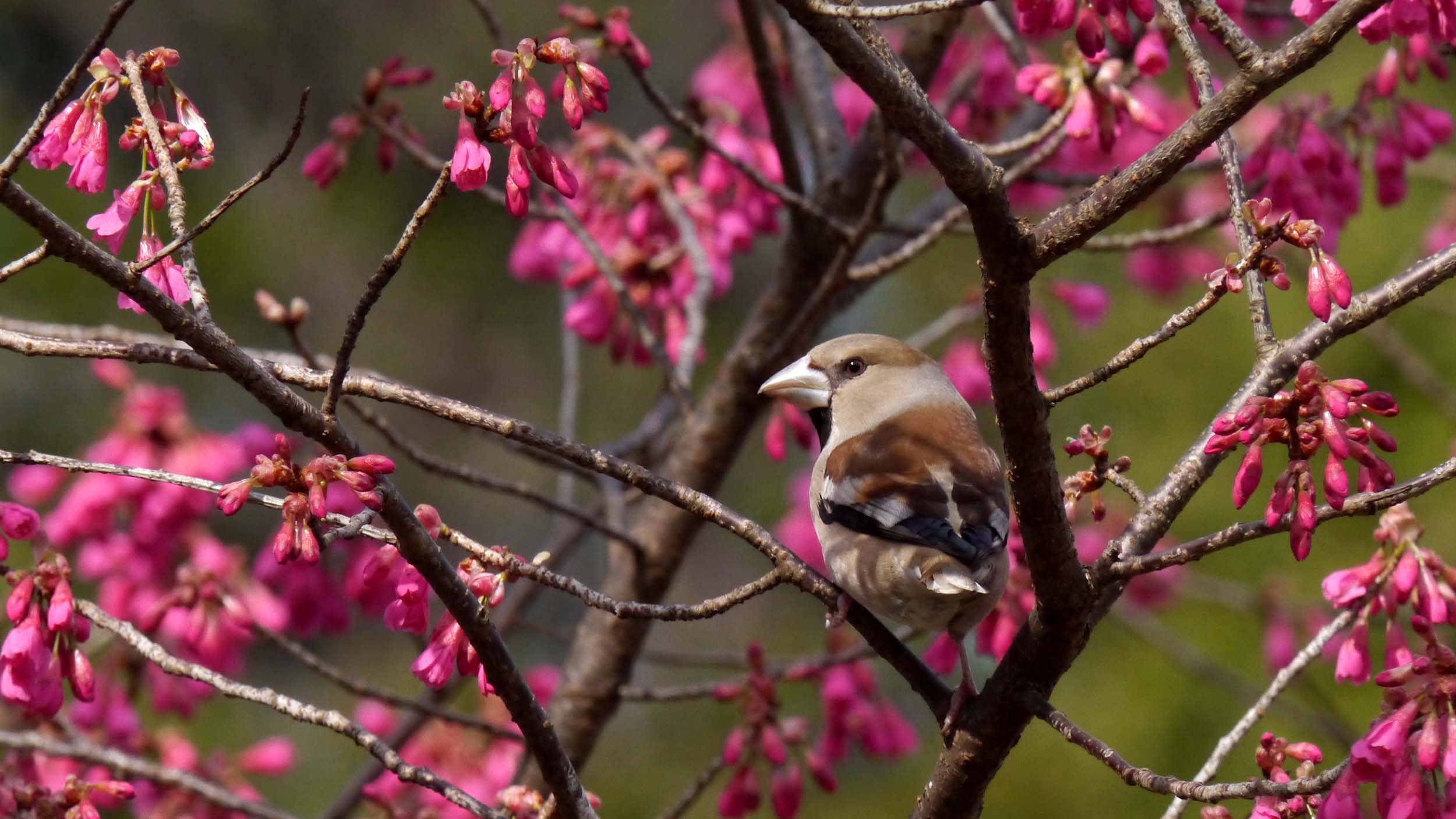 近くに小鳥たちの餌場があるので、カンヒザクラにも止まってくれます。