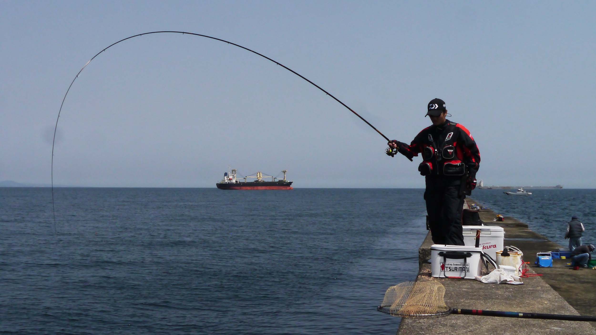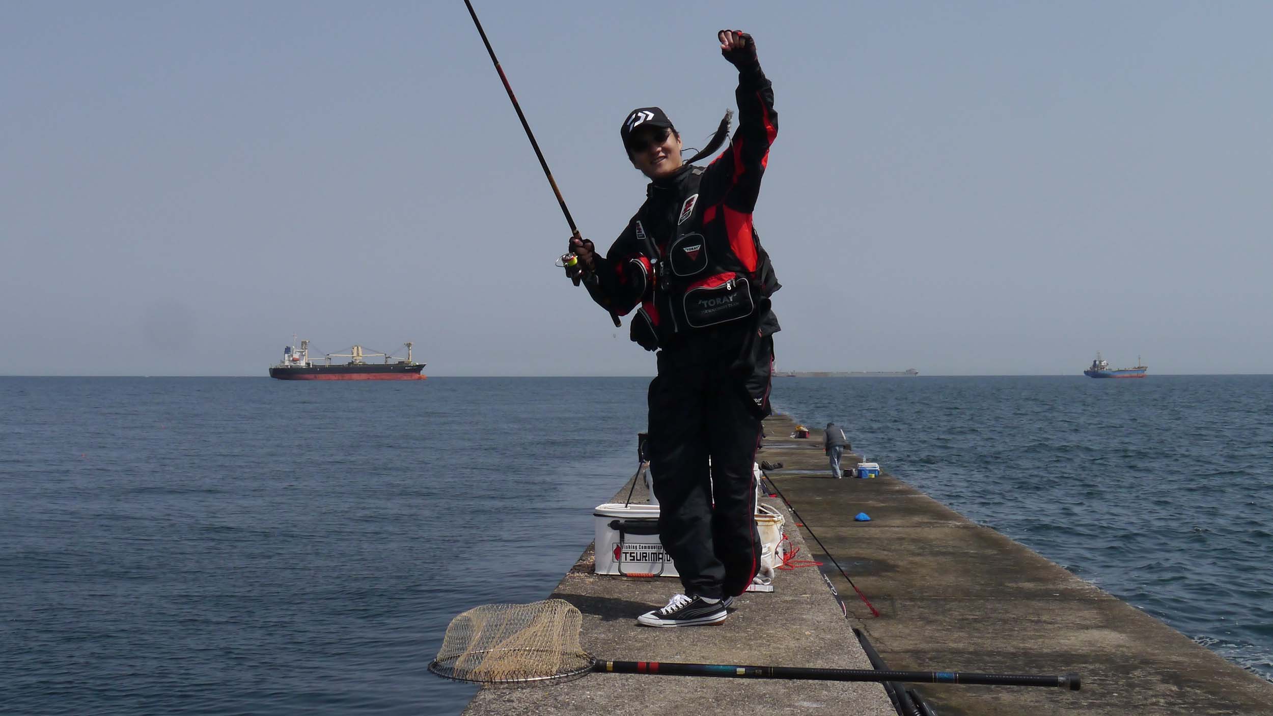 沖一文字は400m足らずの短い防波堤。西側が2mくらいの高さはある犬走りで、その幅は1m弱。渡船に備え付けの梯子を借りて設置し、犬走りに上がって西側を釣るのが多く、犬走り以外の足場は3mくらいの幅があって、海面からは満潮時で50㎝くらいの高さです。こちらを狙うのは、マダイ・カンダイ・チヌなどです。