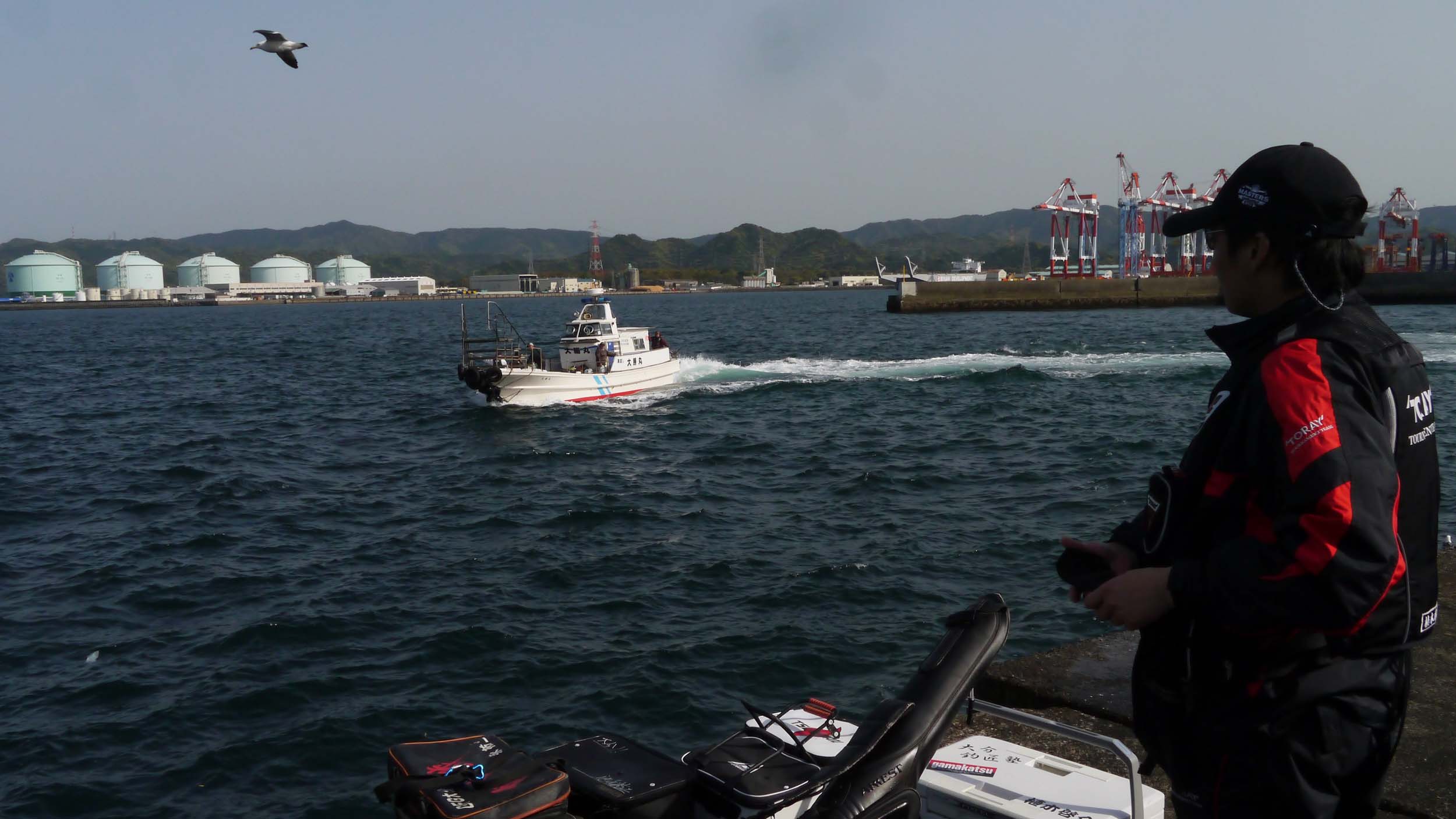 同行者は若手釣り師の植木君。8時出港~16時帰港の工程でした。船長に釣況を尋ねると、沖一文字と新波止が良いとの事。個人的には新波止に渡りたかったのですが、同船の他の釣り客が沖一文字を目指していたので、約3㎞ほど西側の新波止まで行かなくても良い様に、私たち二人も沖一文字に上がったのです。