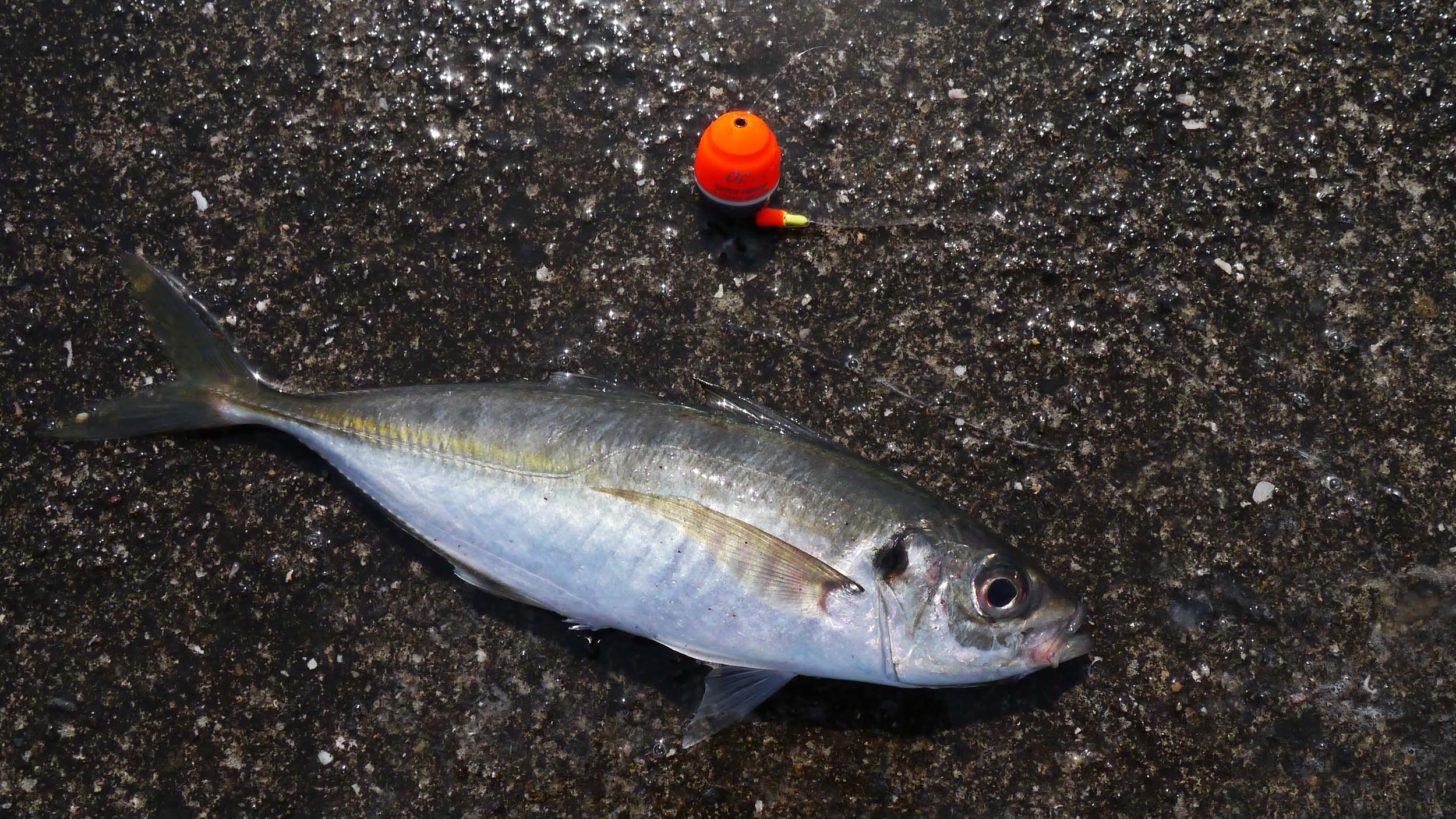 足元でも時折魚影が見える様になったので、防波堤の影を狙うと、一回り大きなアジが釣れはじめ、最大は30㎝級。そして25~29㎝級もコンスタントに出るのです。カゴ釣りの型は23㎝級ですが、足元の影で釣れるアジは抜群のサイズです。タナは1ヒロ~2ヒロ半でとても釣りやすく、延べ竿だったら凄く楽しい釣りが出来た?