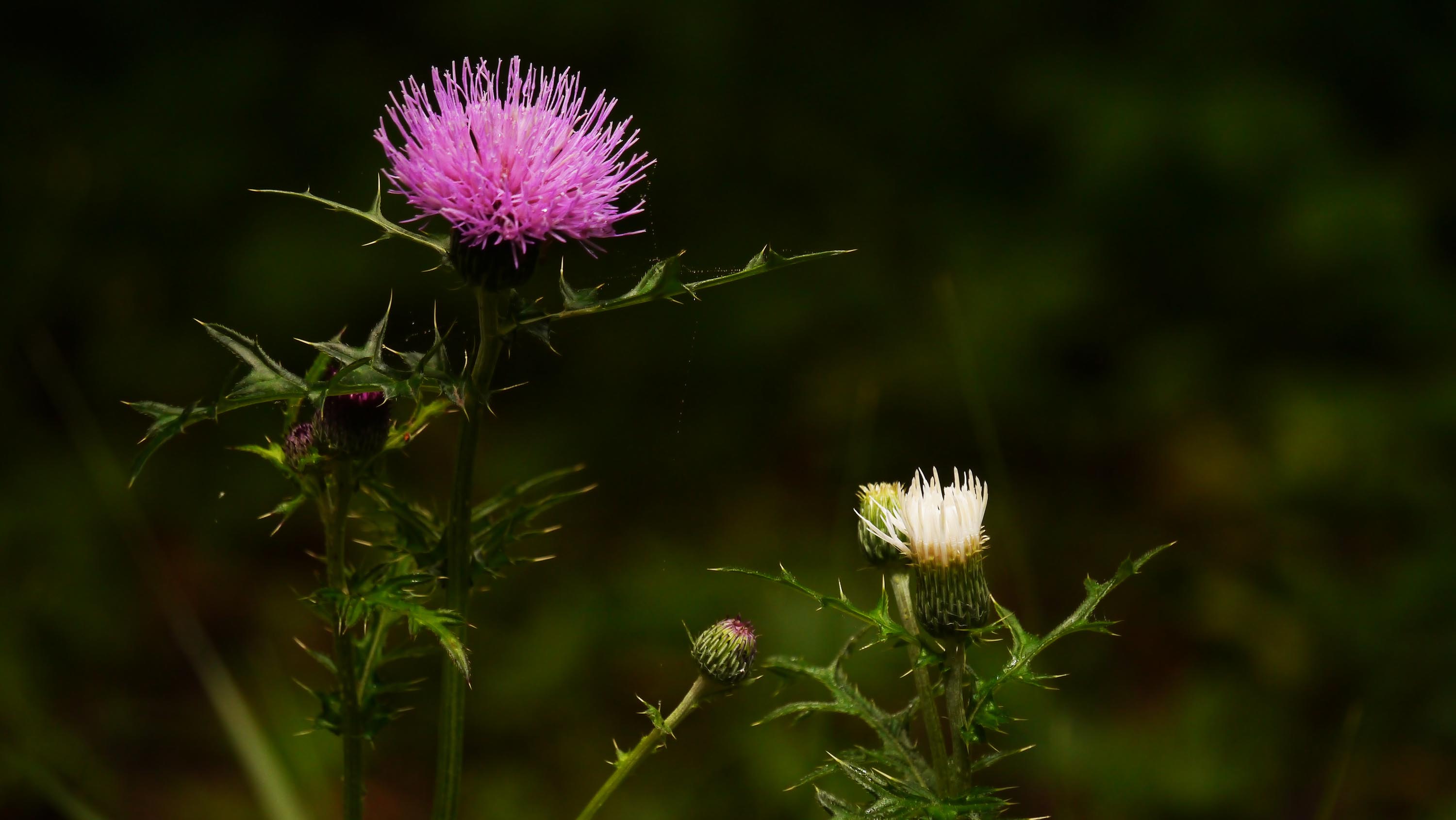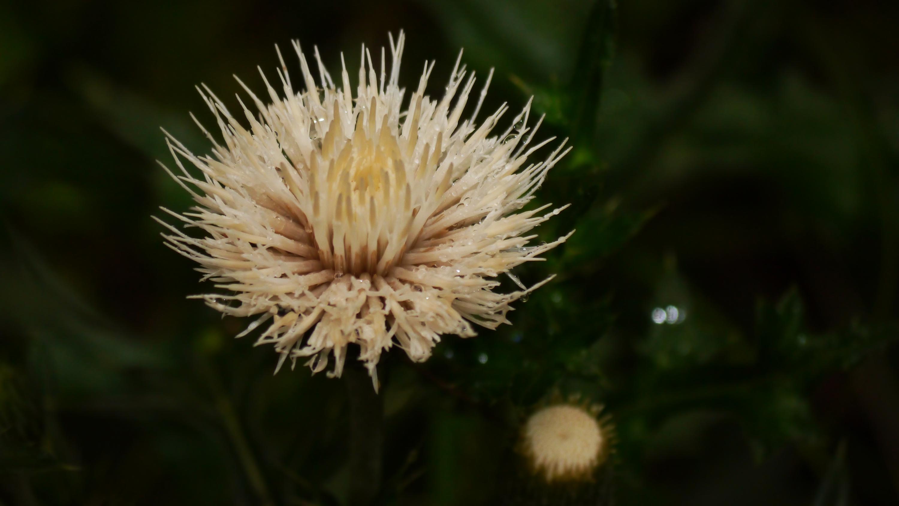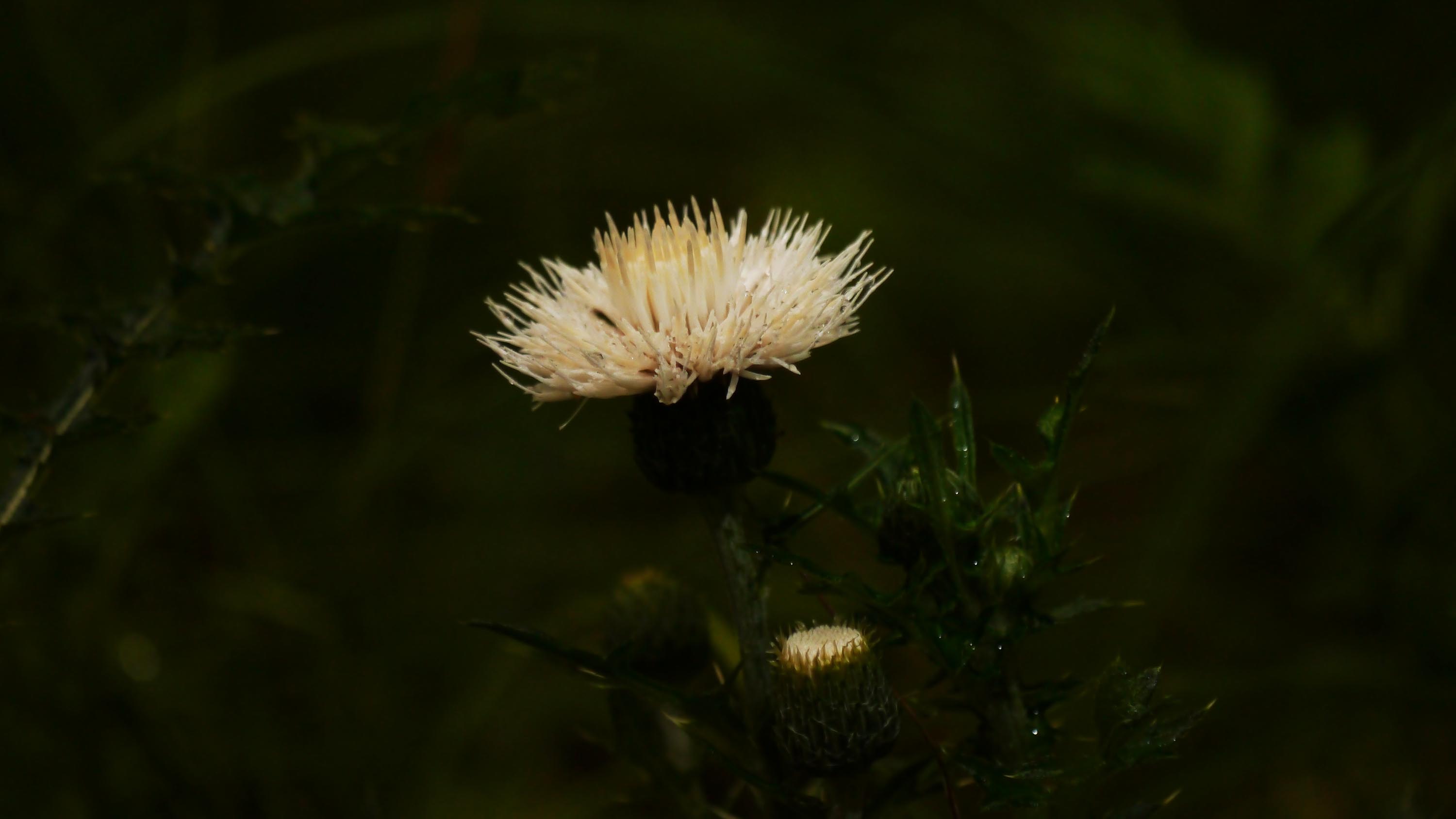 坊主山へ行く道沿いに咲いていた白い花のアザミ。
