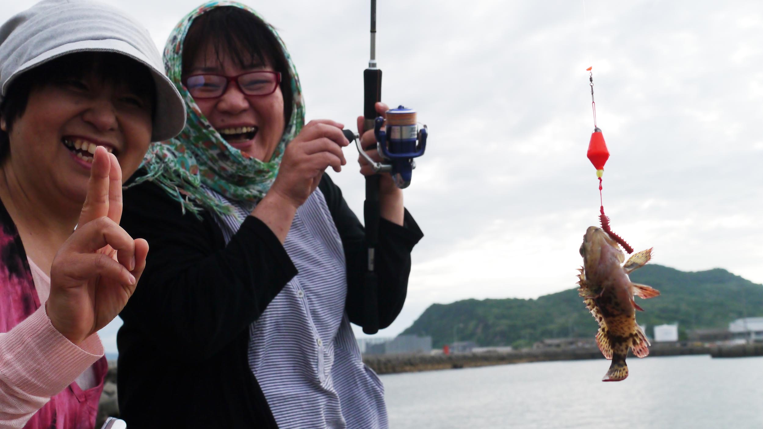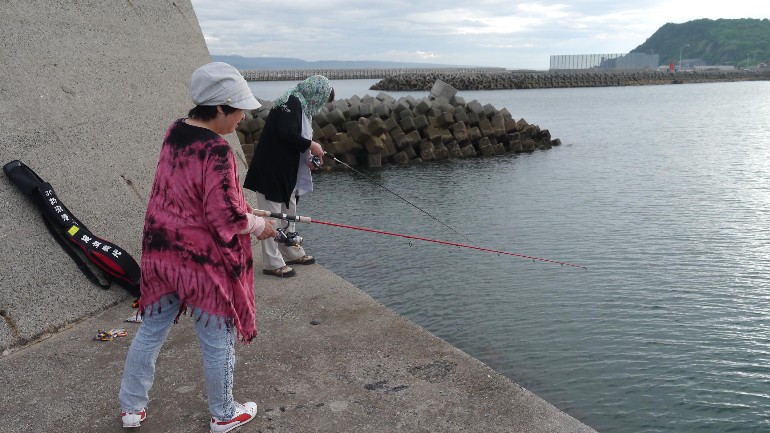 旅館前の防波堤で釣り??