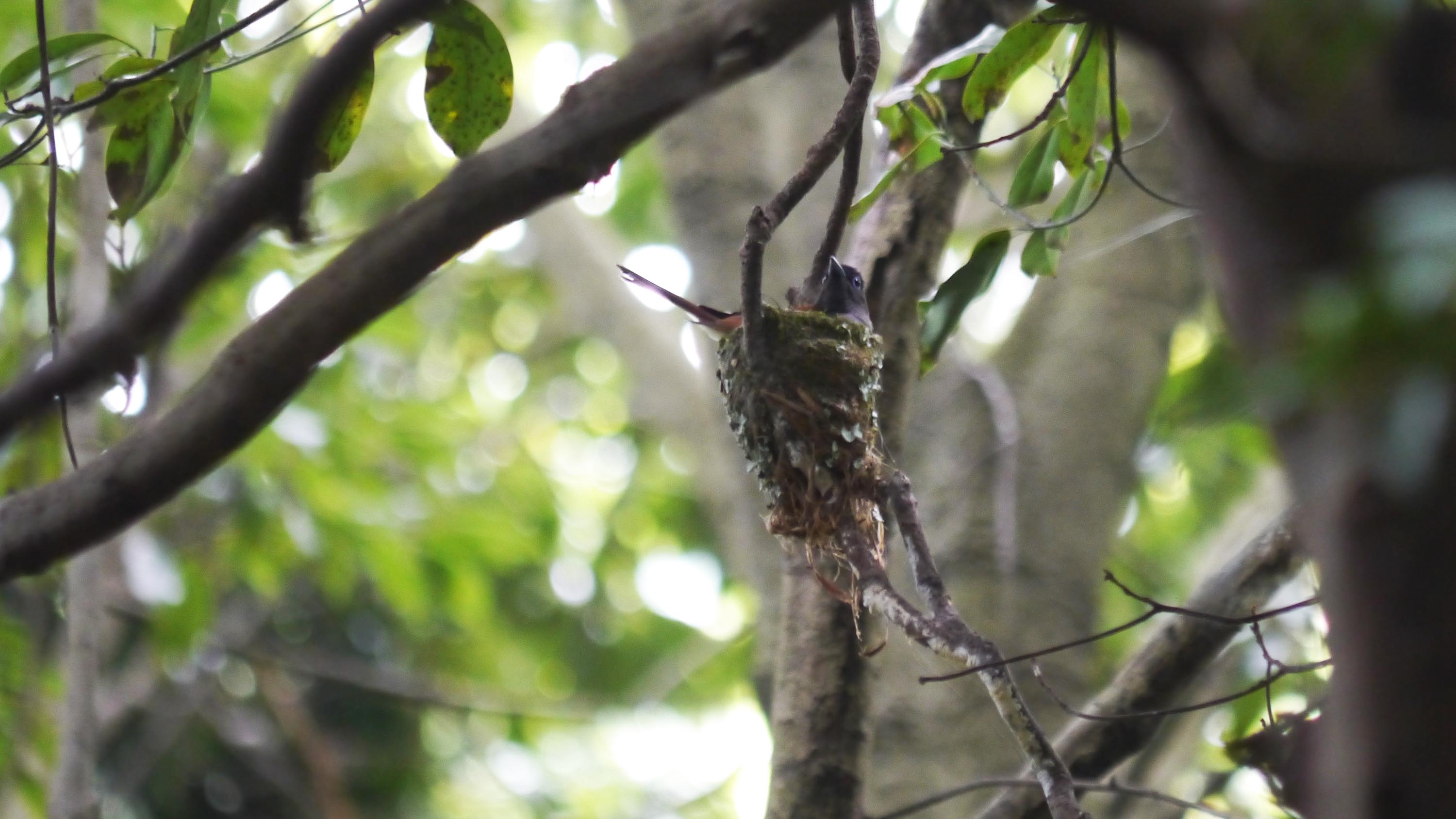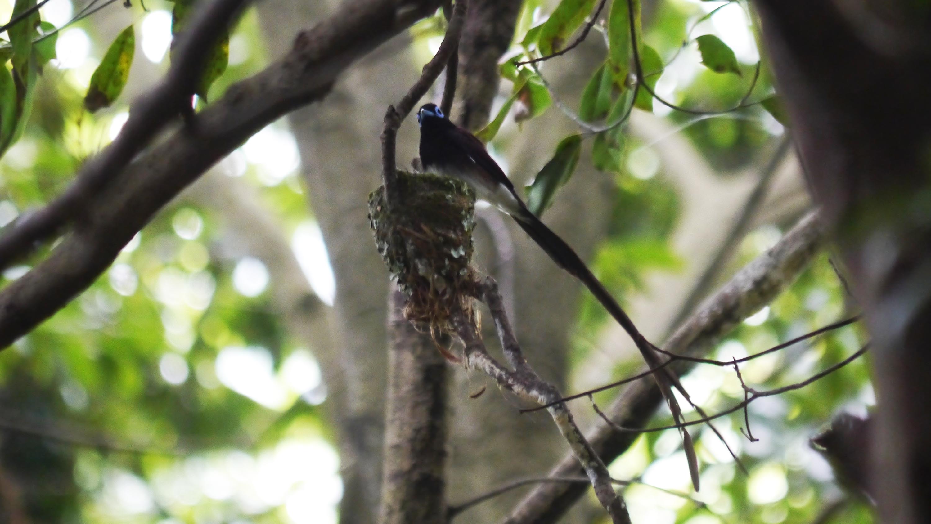 昨日はまだ抱卵中で、巣から体を浮かせるしぐさはオスもメスも見せませんでした。今日は朝から雨、奥のアカショウビンの鳴き声をチェック後、雨が止むのを待ってサンコウチョウの巣に向かったのが10時45分頃。