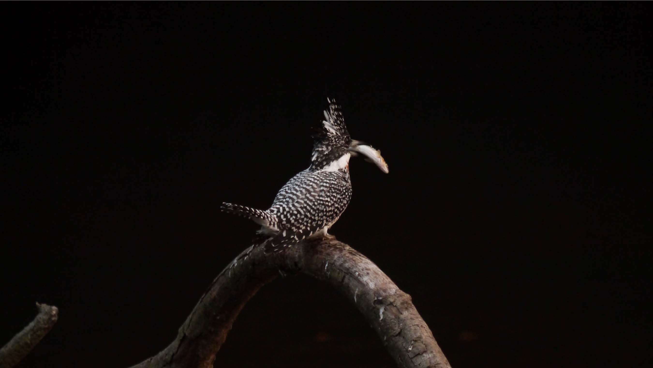 しかしながら、この後咥えているアユを見つけた子供のヤマセミ?が、エサをねだりに飛来。それを察知したお父さんは、素早くレストランから飛び去り、アユの食事風景と食後の水浴びは露と消えたのです。子供は親からエサを貰えなくなっている時期ですね。