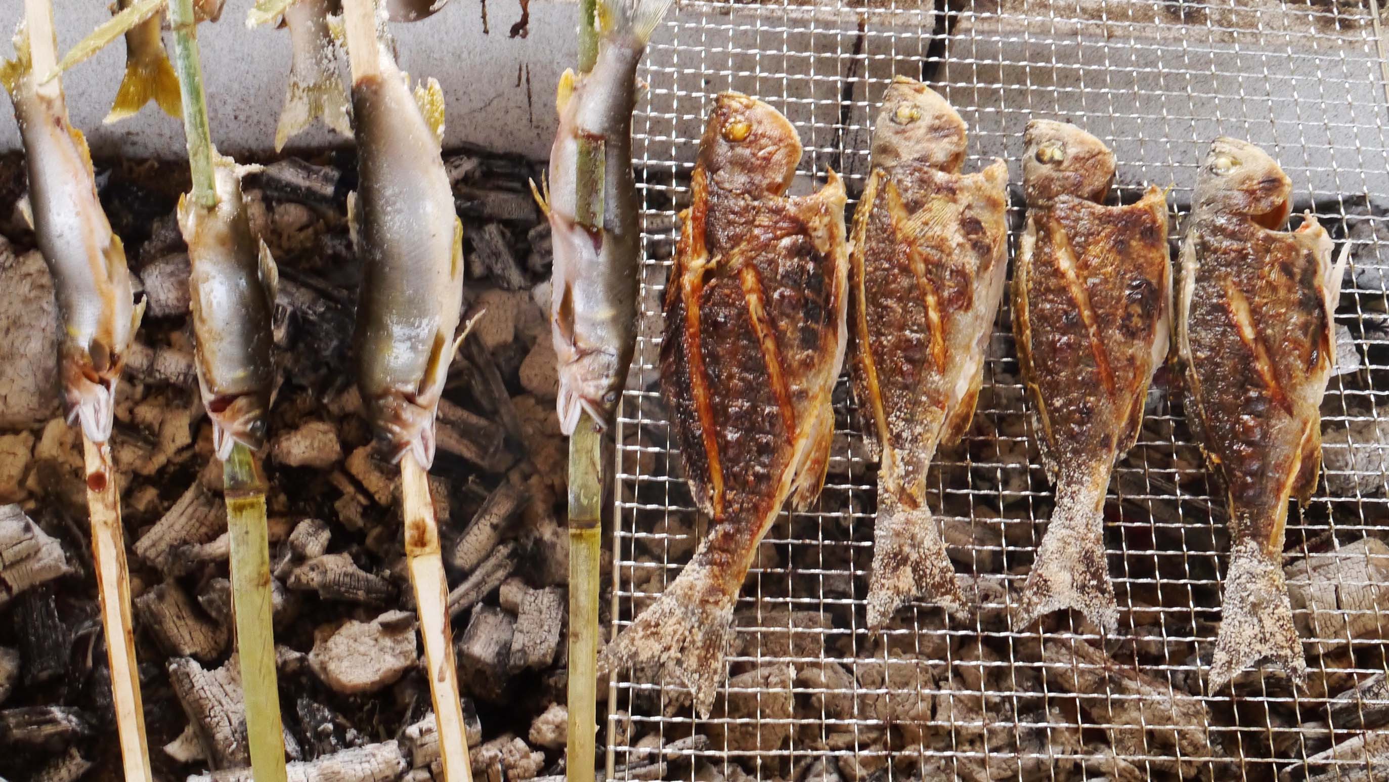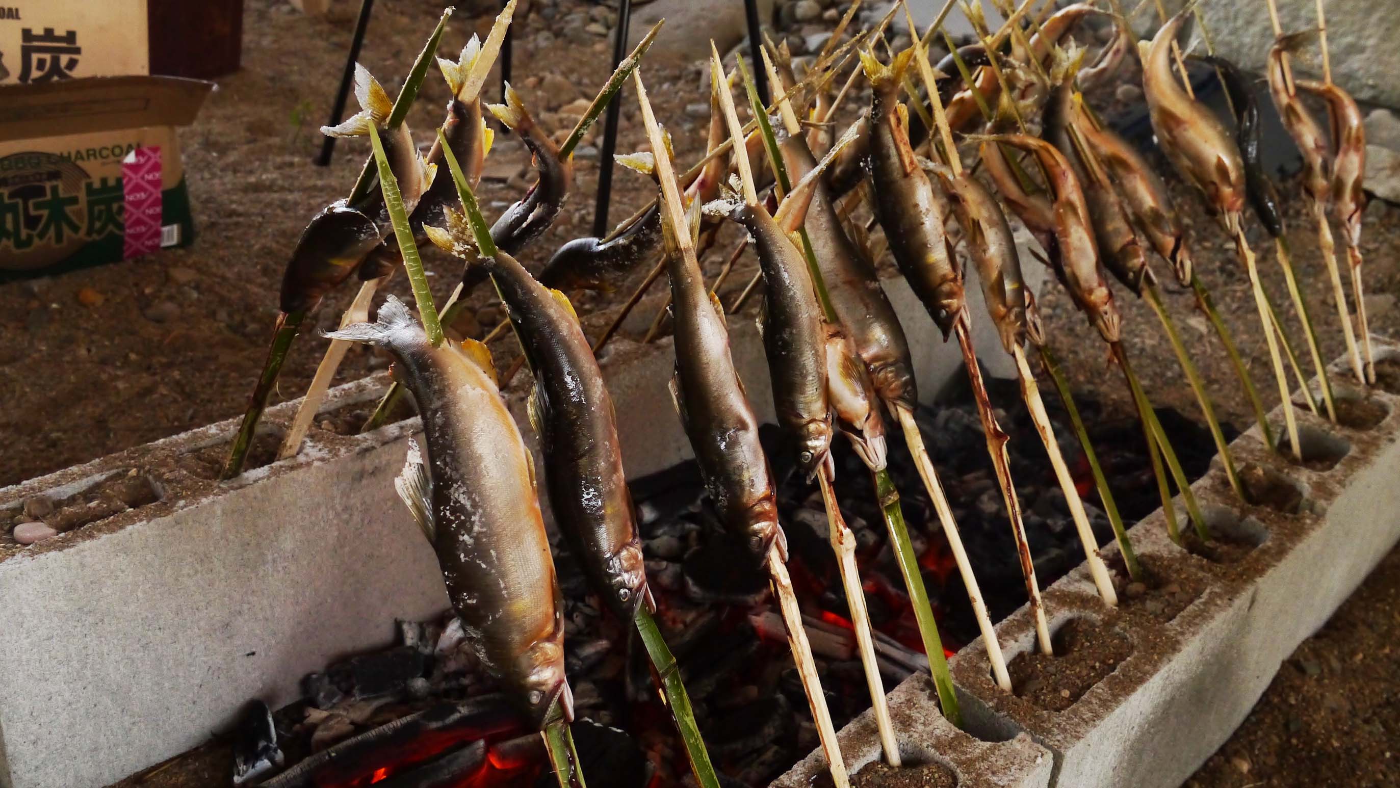 アユの塩焼きは、ブロックと竹串で美味しく焼けます。仕入れ先は猪熊君