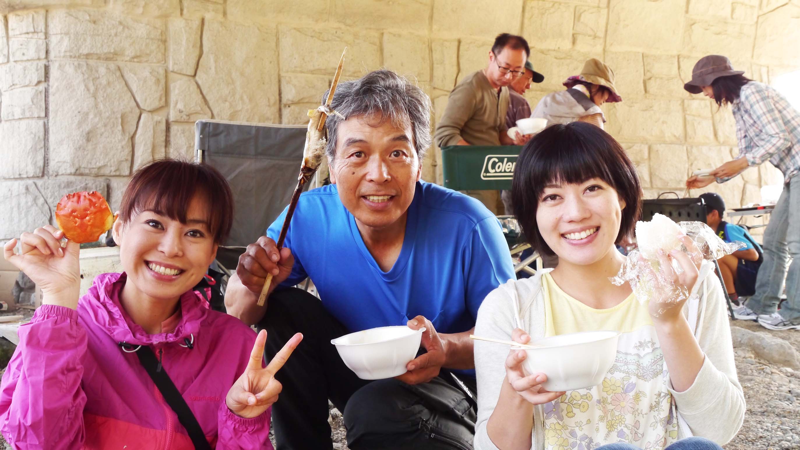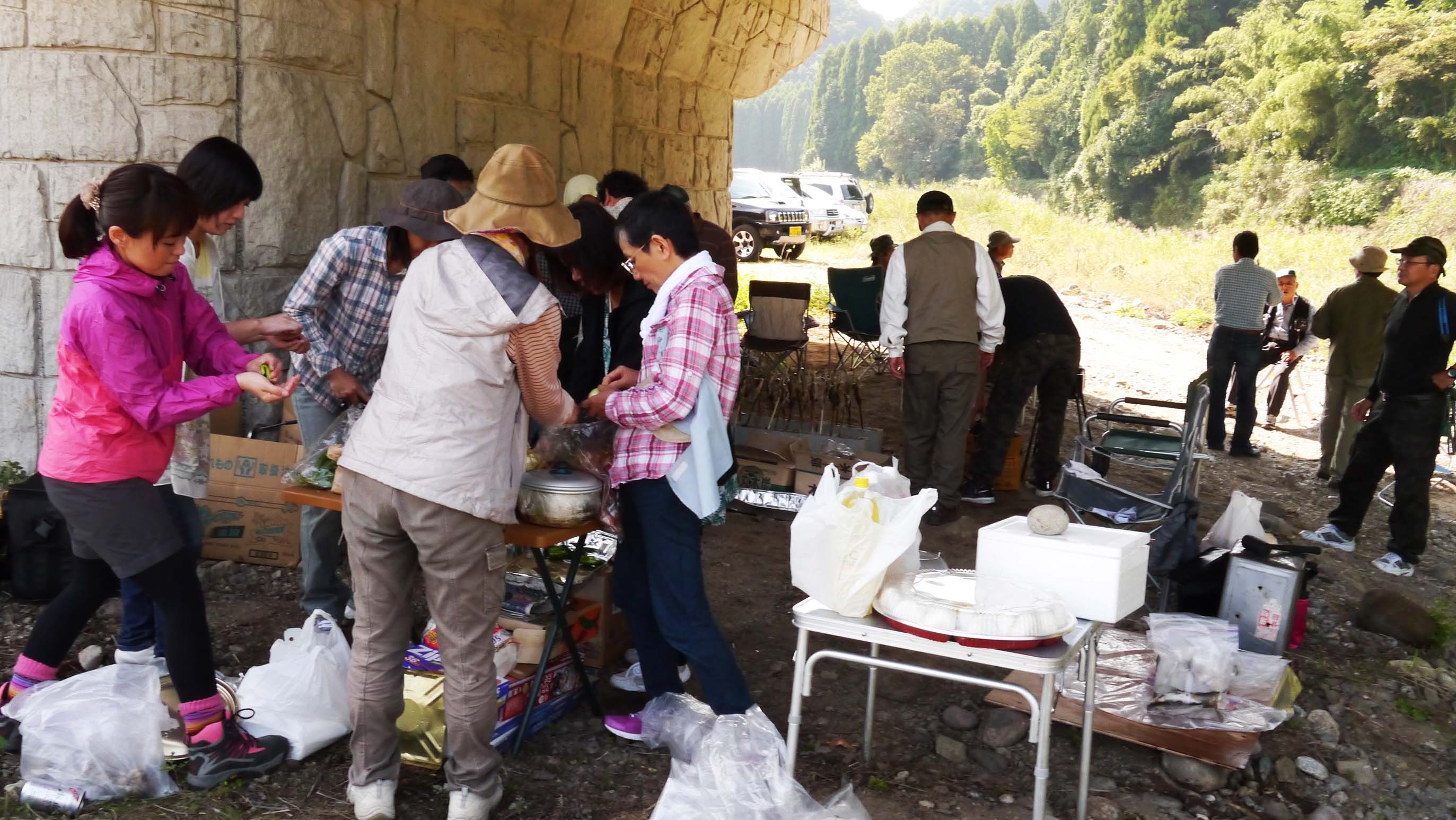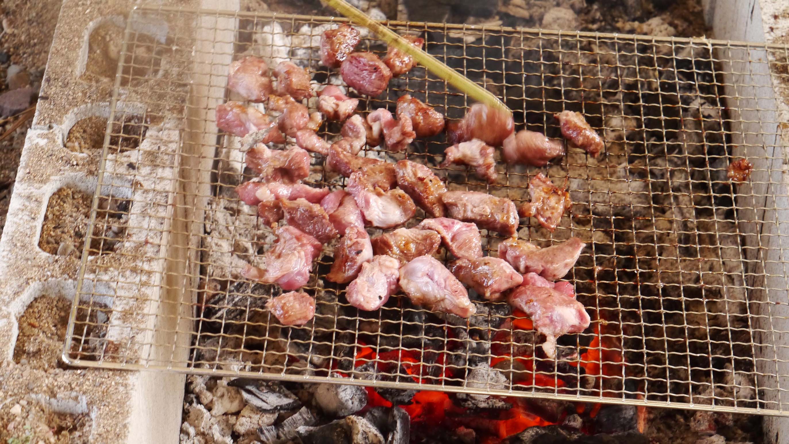 今回は五ヶ瀬川の約40匹ほどのアユを、二日前に作った竹串に刺して炭火でじっくりと焼いた塩焼きがメインです。次が七瀬川の川漁師から仕入れたモクズガニ。20数匹を塩茹で・13匹ほどをガン汁にしました。更に昨日釣った、イサキ・グレ・カワハギ・シマアジ・ヤズ(ブリの仔)などの刺身と塩焼き。肉やおにぎり・柿やナシをはじめ、色んな差し入れも食べると動くのがきつく大変です。