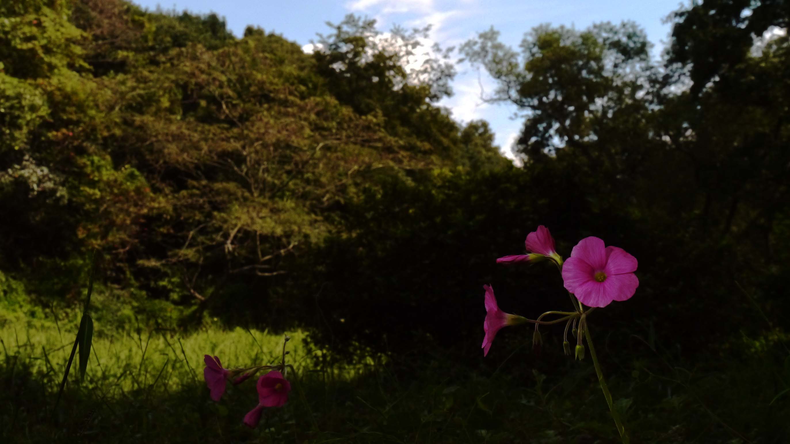ピンクのカタバミが秋空の下で花弁を開いています