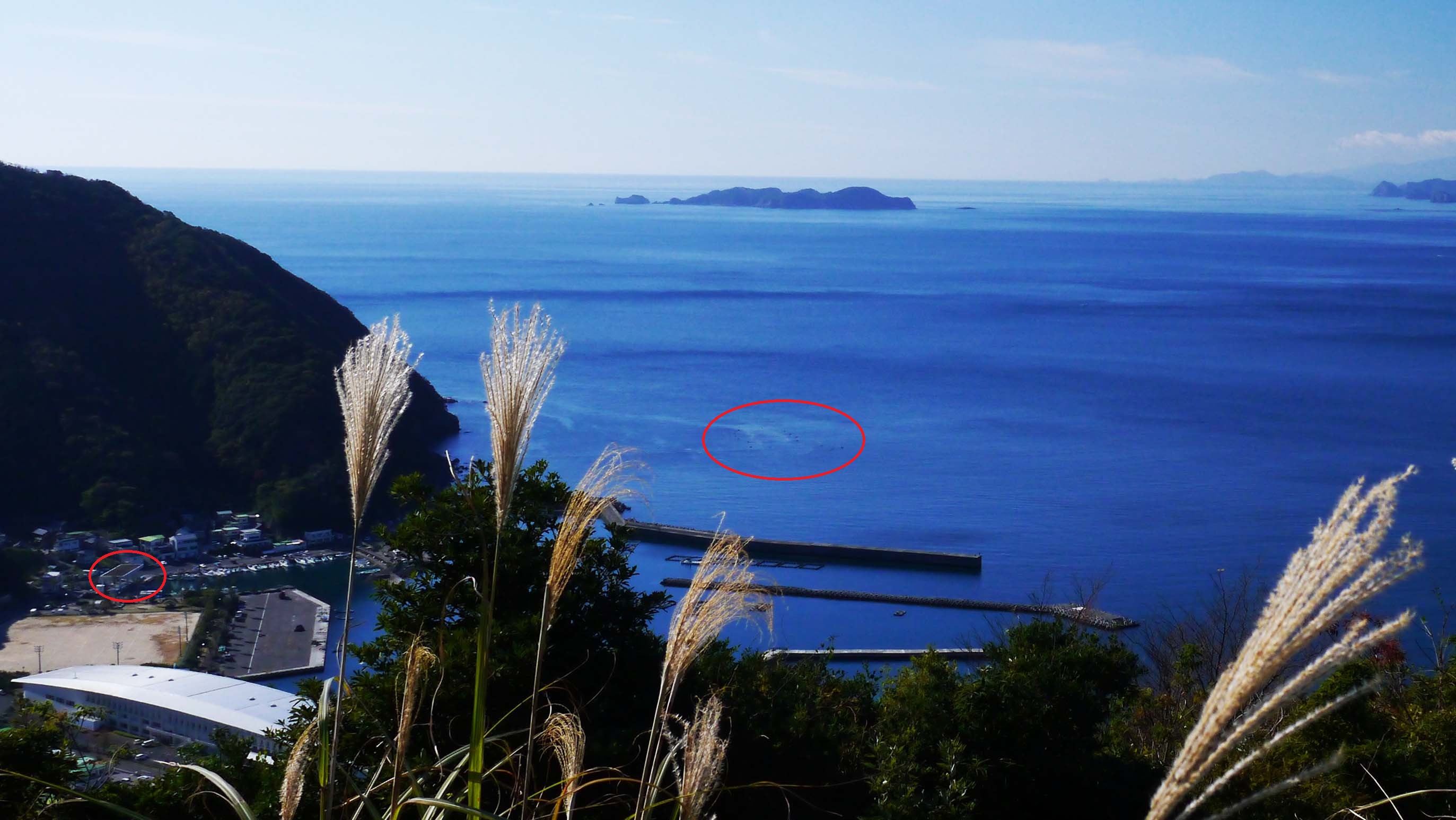 港の直ぐ沖の赤丸が今回の定置網~左の赤丸が漁協。この場所での作業