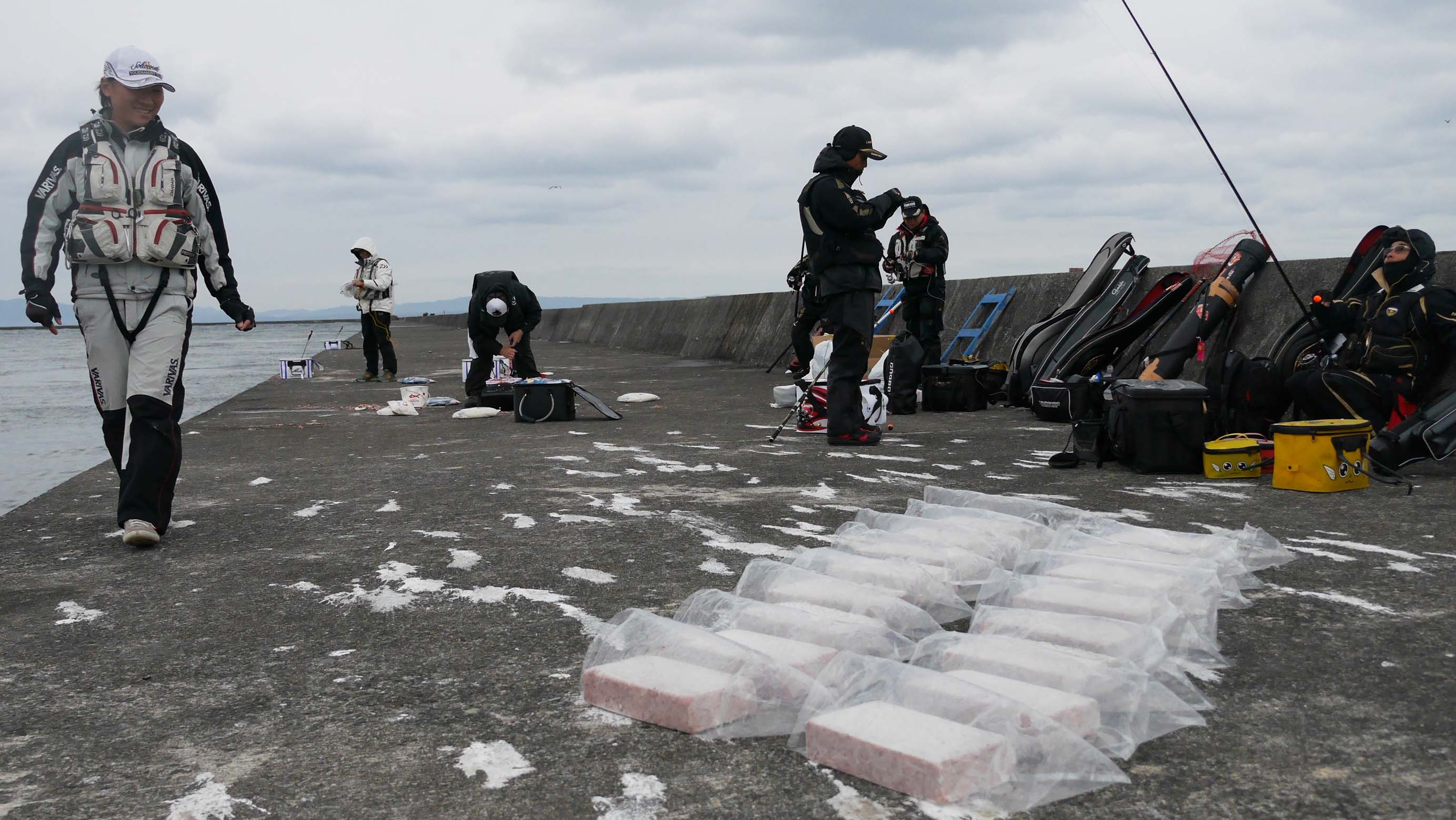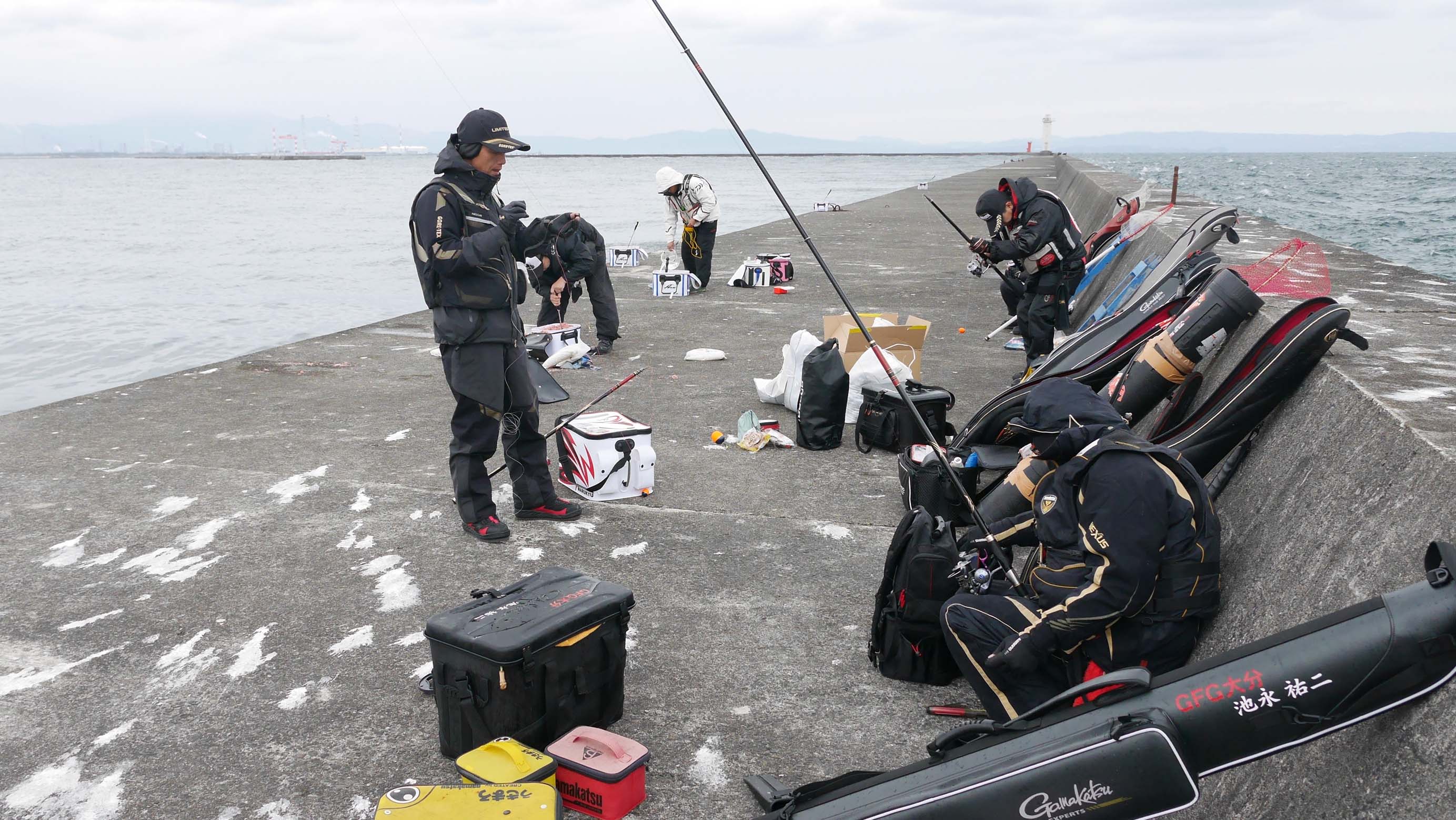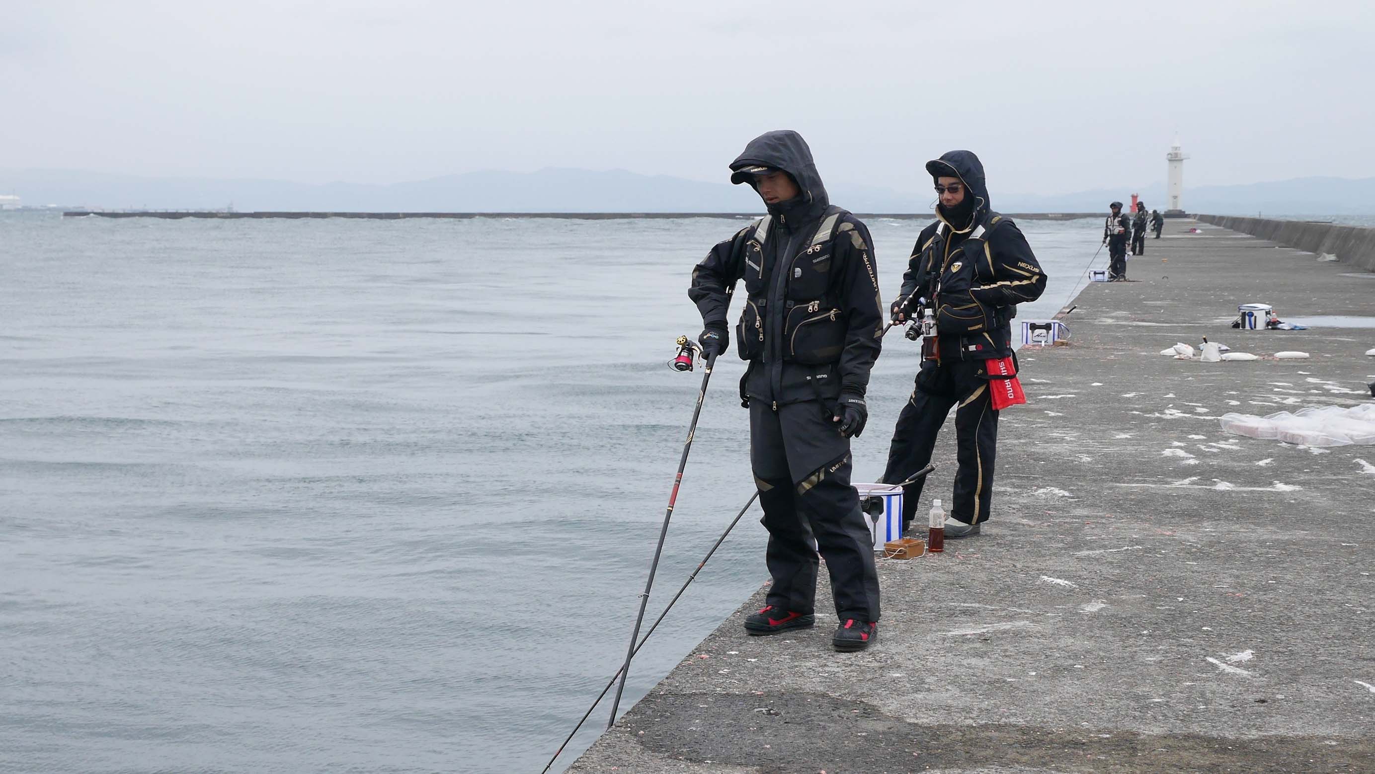 北東の風が強いので沖側を向いて釣る事は出来ません。波しぶきが波止を越える事もしばしばあり、道具類が濡れ始めていましたが、今度は冷たい雨が落ち始めました。これには南国育ちの皆は我慢できない様で、シートにくるまって防寒防雨対策したりと可哀そうなくらい・・・。