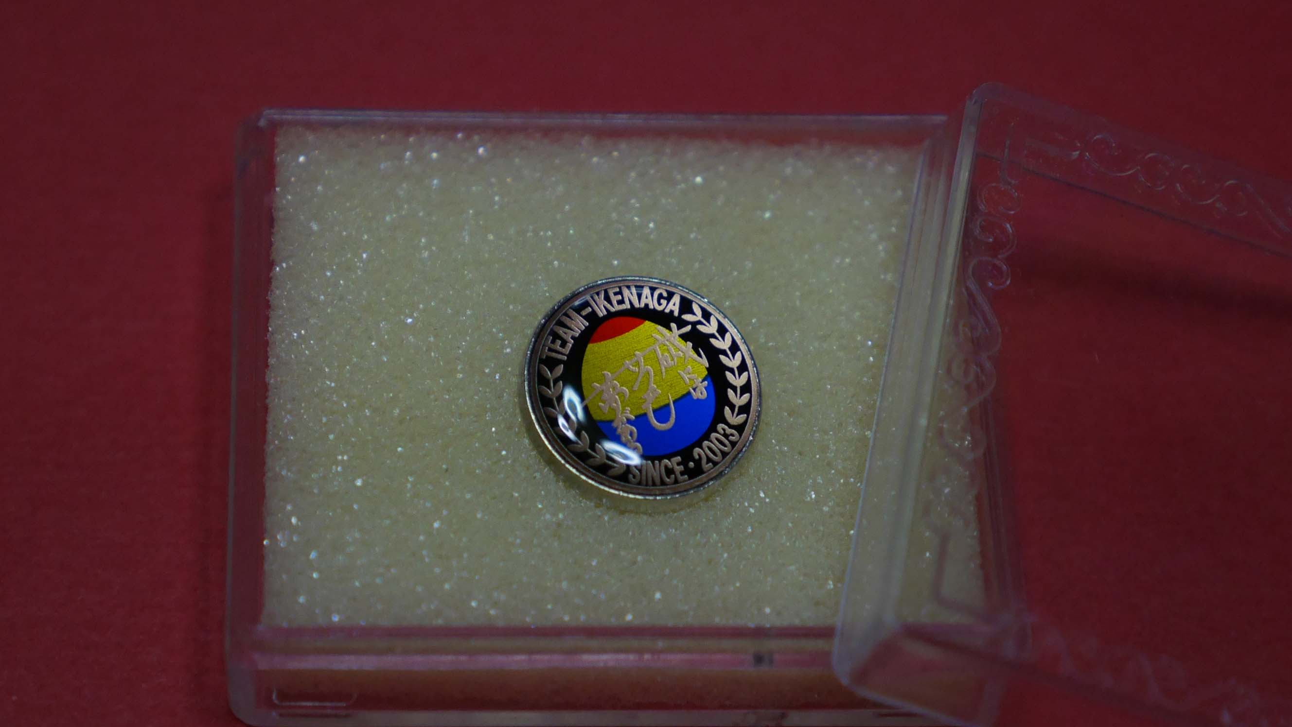 このバッジは、私が考案した釣研のエキスパートグレと"磯にはいつも夢がある”のサインをデザイン化したものです。全国大会で優勝すると金バッジ、2~3位になった場合は銀バッジ、全国大会で戦った人に銅バッジを、TEAM池永に所属している人に差し上げているもの。金と銀は少なくなっており、銅バッジは10数個くらい残っている代物です。